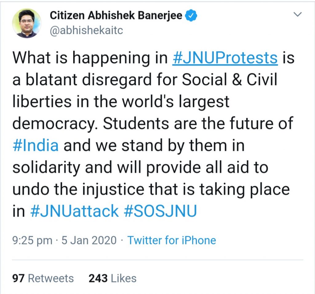 জেএনইউ-এর হস্টেলে পড়ুয়াদের উপর হামলার ঘটনার তীব্র নিন্দা করলেন তৃণমূল সাংসদ অভিষেক বন্দ্যোপাধ্যায়। ঘটনার খবর পাওয়ার পরেই নিজের টুইটারে তিনি লেখেন, “পৃথিবীর সর্ববৃহৎ গণতন্ত্রের প্রতি এই ঘটনা চূড়ান্ত অসম্মানজনক।” ছাত্রছাত্রীদের প্রতি সহমর্মিতা জানিয়ে যুব তৃণমূল সভাপতি লেখেন এই ঘটনায় তিনি তাঁদের পাশে আছেন।