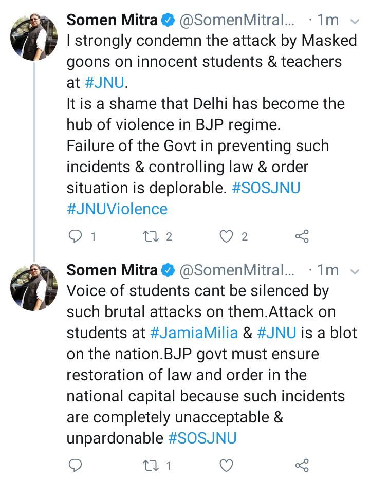 নিন্দায় সরব হয়েছেন প্রদেশ কংগ্রেস সভাপতি সোমেন মিত্রও। তিনি ঘটনার তীব্র নিন্দা করে লেখেন, দেশের রাজধানীতে ঐতিহ্যশালী একটি শিক্ষাঙ্গনে ছাত্রছাত্রী ও শিক্ষকদের ওপর এমন আক্রমণ প্রমাণ করে দেশের আইন-শৃঙ্খলা ভেঙে পড়েছে। আইন রক্ষায় সরকার পুরোপুরি ব্যর্থ।