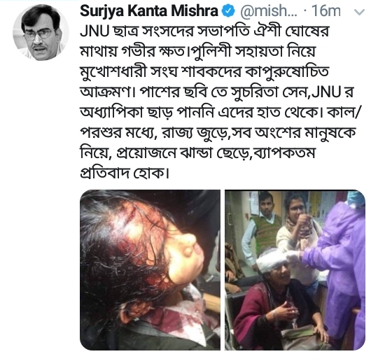 এদিন এক টুইট বার্তায় এই ঘটনার তীব্র নিন্দা করে সূর্যকান্ত মিশ্র লেখেন, “JNU ছাত্র সংসদের সভাপতি ঐশী ঘোষের মাথায় গভীর ক্ষত। পুলিশি সহায়তা নিয়ে মুখোশধারী সংঘ শাবকদের কাপুরুষোচিত আক্রমণ। পাশের ছবিতে সুচরিতা সেন, JNU র অধ্যাপিকা ছাড় পাননি এদের হাত থেকে। কাল/পরশুর মধ্যে, রাজ্য জুড়ে, সব অংশের মানুষকে নিয়ে, প্রয়োজনে ঝান্ডা ছেড়ে, ব্যাপকতম প্রতিবাদ হোক।”