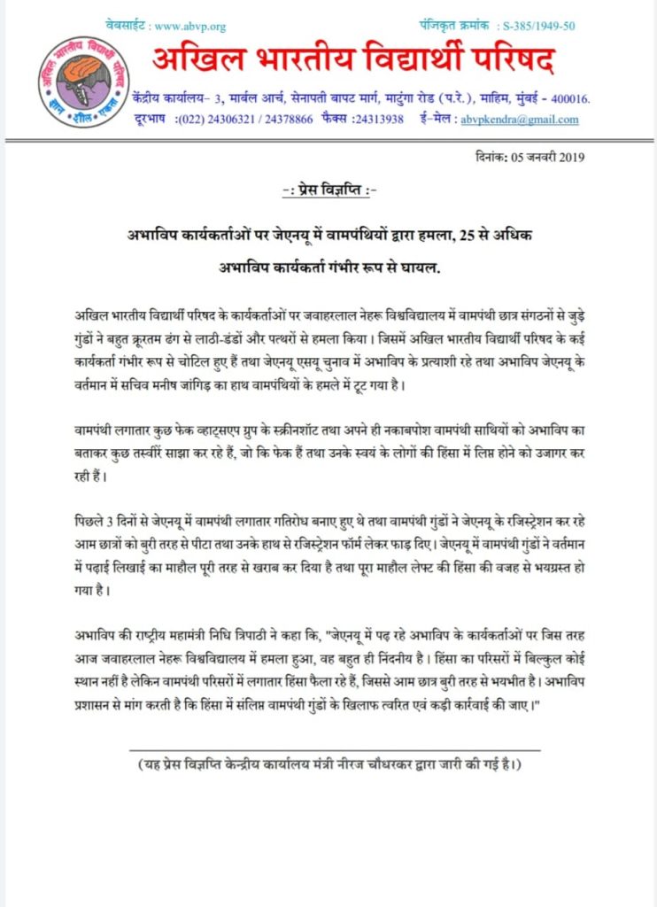 JNU কাণ্ডের পর এক বিবৃতিতে ABVP জানাচ্ছে,