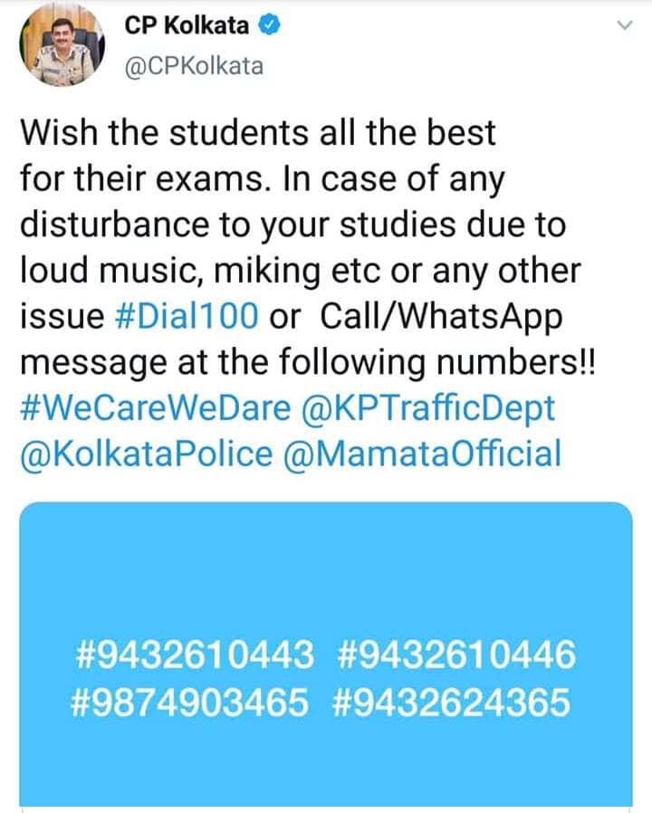 কলকাতার নগরপাল অনুজ শর্মা টুইটারে পরীক্ষার্থীদের শুভেচ্ছা জানিয়ে বলেছেন, ‘‘মাইক, লাউডস্পিকার বা অন্য অসুবিধা হলেই ফোন বা হোয়াটসঅ্যাপ করে জানান।’’ ওসি এবং ডিসিদের পরীক্ষার সময়ে শব্দদূষণ আটকাতে সতর্ক থাকতে বলেছেন নগরপাল।
