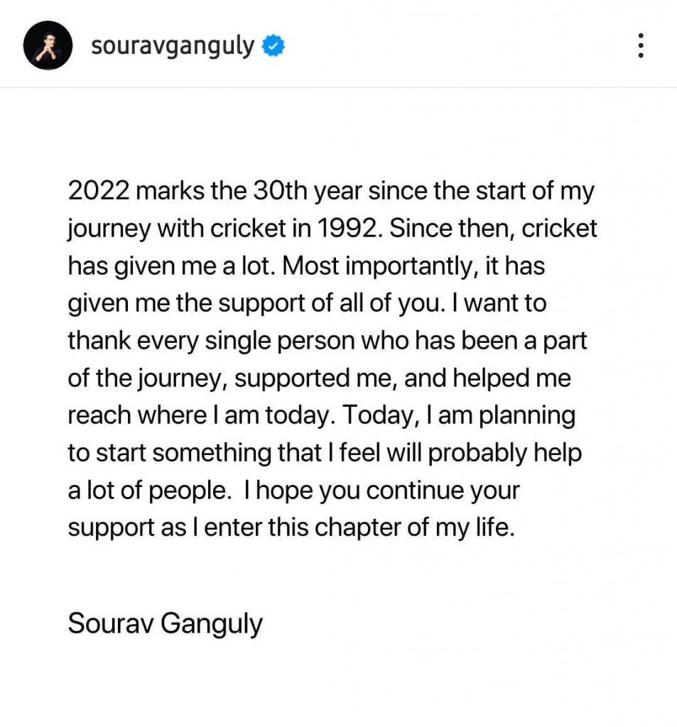 মঙ্গলবার সোশ্যাল মিডিয়ায় একটি পোস্ট করেন সৌরভ। যেখানে তিনি লেখেন, “সেই ১৯৯২ সাল থেকে আজ ২০২২ আমার ক্রিকেট সফর ৩০ বছর পার করল। ক্রিকেট আমায় অনেক কিছু দিয়েছে। সবচেয়ে গুরুত্বপূর্ণ ক্রিকেট আমায় মানুষের সমর্থন ও ভালোবাসা দিয়েছে। আমি তাদের প্রত্যেককে ধন্যবাদ জানাই যারা এই সফরে আমার সঙ্গি ছিলেন, সমর্থন করেছেন, এবং যাদের সাহায্যে আমি আজ এই জায়গায় পৌঁছেছি। এখন আমি এমন কিছু শুরু করার পরিকল্পনা করছি যা মানুষের উপকারে আসে। আমার এই নতুন যাত্রায় আপনাদের সকলের সমর্থন আমি আশা করি।” সৌরভের এই টুইটের পর স্বাভাবিকভাবেই জল্পনা শুরু হয়েছে এবার হয়ত তিনি বিসিসিআইয়ের সভাপতি পদ থেকে ইস্তফা দিতে চলেছেন। পাশাপাশি জল্পনা বাড়তে থাকে, রাজ্যসভাতে প্রার্থী হতে পারেন তিনি। তবে সুত্রের খবর, সৌরভের বিসিসিআই সভাপতি পদ থেকে ইস্তফা সংক্রান্ত কোনও খবর এখন পর্যন্ত পাওয়া যায়নি। আর এই গোটা বিসয়টিই একটি বিজ্ঞাপনী চমক। বিসিসিআইয়ের সহসভাপতি জয় সাহা একটি টুইট করে জানান, সৌরভ বিসিসিআইয়ের সভাপতি পদ থেকে ইস্তফা দেননি।