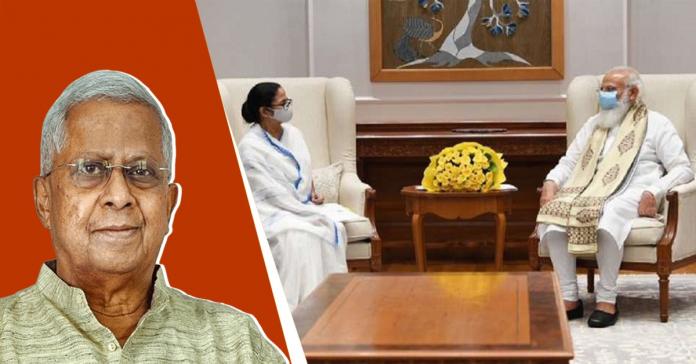 রাজ্যের বকেয়া টাকা মেটানোর দাবিতে মোদি (Narendra Modi) সাক্ষাতে পূর্ব নির্ধারিত সূচী মেনে দিল্লি (Delhi) গিয়েছেন মুখ্যমন্ত্রী মমতা বন্দ্যোপাধ্যায় (Mamata Banerjee)। তবে পার্থই ইস্যুকে হাতিয়ার করে এই সাক্ষাৎকে অন্যভাবে ব্যাখ্যা করতে শুরু করেছে বিরোধী দল সিপিএম ও কংগ্ৰেস। এই সেই অংকেই গল্পের গরুকে গাছে তুলে নিজের দলকেই অস্বস্তিতে ফেললেন তথাগত রায়(Tathagata Ray)। মোদি মমতার এই বৈঠকে যে কোনওরকম বোঝাপড়া নেই তা প্রমাণ করার দাবি জানিয়ে প্রধানমন্ত্রীকে কার্যত চ্যালেঞ্জ ছুঁড়লেন তিনি।