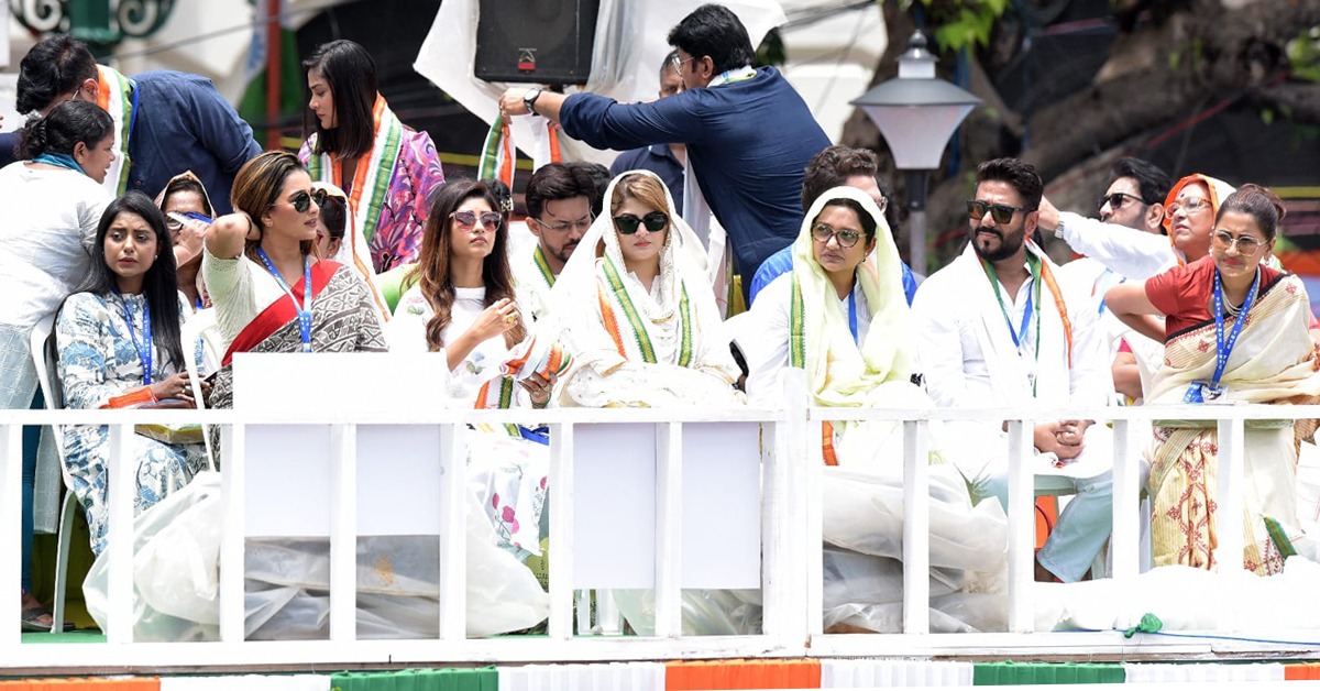 রবিবার ২১ জুলাই। প্রতিবছরের মতো এবছরও ধর্মতলায় (Dharmatala) শহিদ দিবস (Sahid Dibas) পালন তৃণমূল কংগ্রেসের (TMC)। রবিবাসরীয় সভায় কর্মী, সমর্থকদের উৎসাহ ও উদ্দীপনা ছিল চোখে পড়ার মতো। এদিন রোদ, বৃষ্টি মাথায় নিয়েই ধর্মতলার শহিদ সভায় রেকর্ড জনসমাগম চোখে পড়ে। তবে এবছর শহিদ দিবসের গুরুত্ব অন্যান্য বছরের তুলনায় একটু হলেও আলাদা। সদ্য সমাপ্ত লোকসভা ভোটে বড় সাফল্যের পর এদিন ছিল তৃণমূলের মেগা কর্মসূচি। সকাল সকাল দলনেত্রীর বার্তা শুনতে ভিড় জমান কর্মী, সমর্থকরা। এদিন একদিকে যেমন দলের প্রথম সারির নেতা-কর্মীরা নজর কেড়েছেন তাঁদের পাশাপাশি সমানভাবে নজরে এসেছেন টলিপাড়ার কলাকুশলীরা। না তাঁদের সবার পরিচয় যে শুধুমাত্র রুপোলী পর্দায় সীমাবদ্ধ তা নয় রাজনীতিতেও অনেকের অবদান বিশেষ উল্লেখযোগ্য।