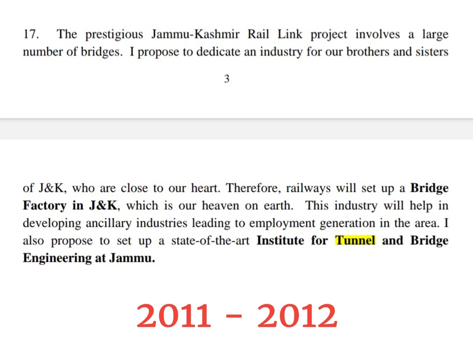 ২০১১ সালের বাজেট বক্তৃতায় জম্মু ও কাশ্মীরে ব্রিজ ফ্যাক্টরি এবং জম্মুতে ইনস্টিটিউট ফর টানেল অ্যান্ড ব্রিজ ইঞ্জিনিয়ারিং তৈরি করার কথা ঘোষণা করেন তৎকালীন রেলমন্ত্রী। কারণ ওই এলাকায় রেল লাইন পাতার জন্য অনেক টানেল নির্মাণের দরকার ছিল। এর পাশাপাশি, কাশ্মীরে একটি ইনস্টিটিউট অফ টানেল অ্যান্ড ব্রিজ ইঞ্জিনিয়ারিংর কথাও জানান মমতা।