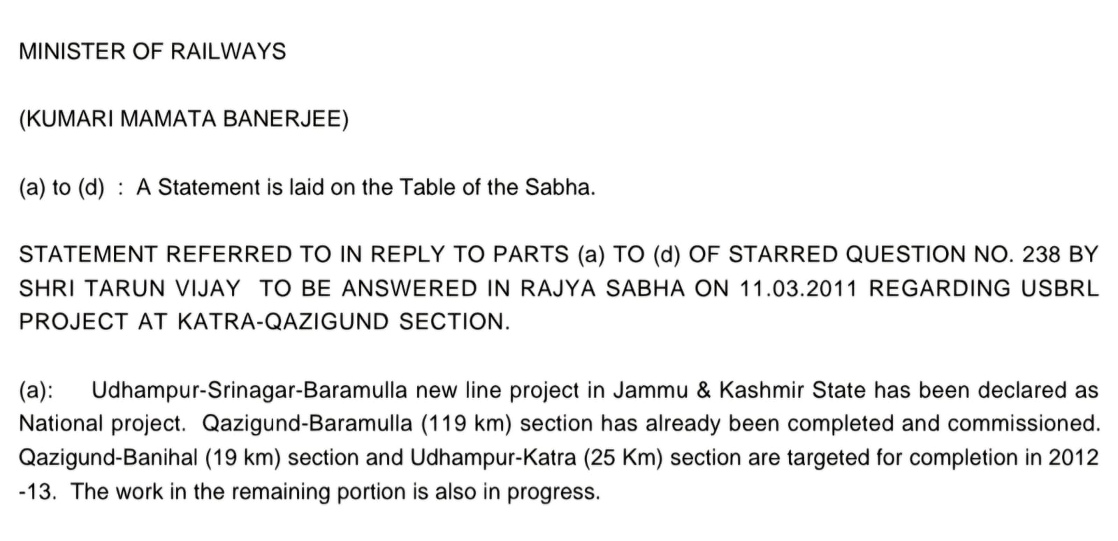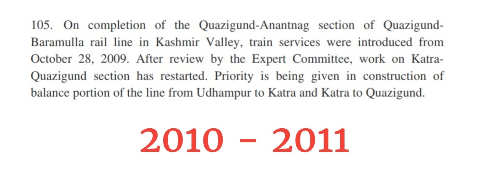 ৪. ২০১০ সালে কাটরা-কাজিগুন্ড সেকশনের পর্যালোচনা করে পুরোদমে কাজ শুরুর অনুমোদন দিয়েছিলেন রেলমন্ত্রী মমতা বন্দ্যোপাধ্যায়।