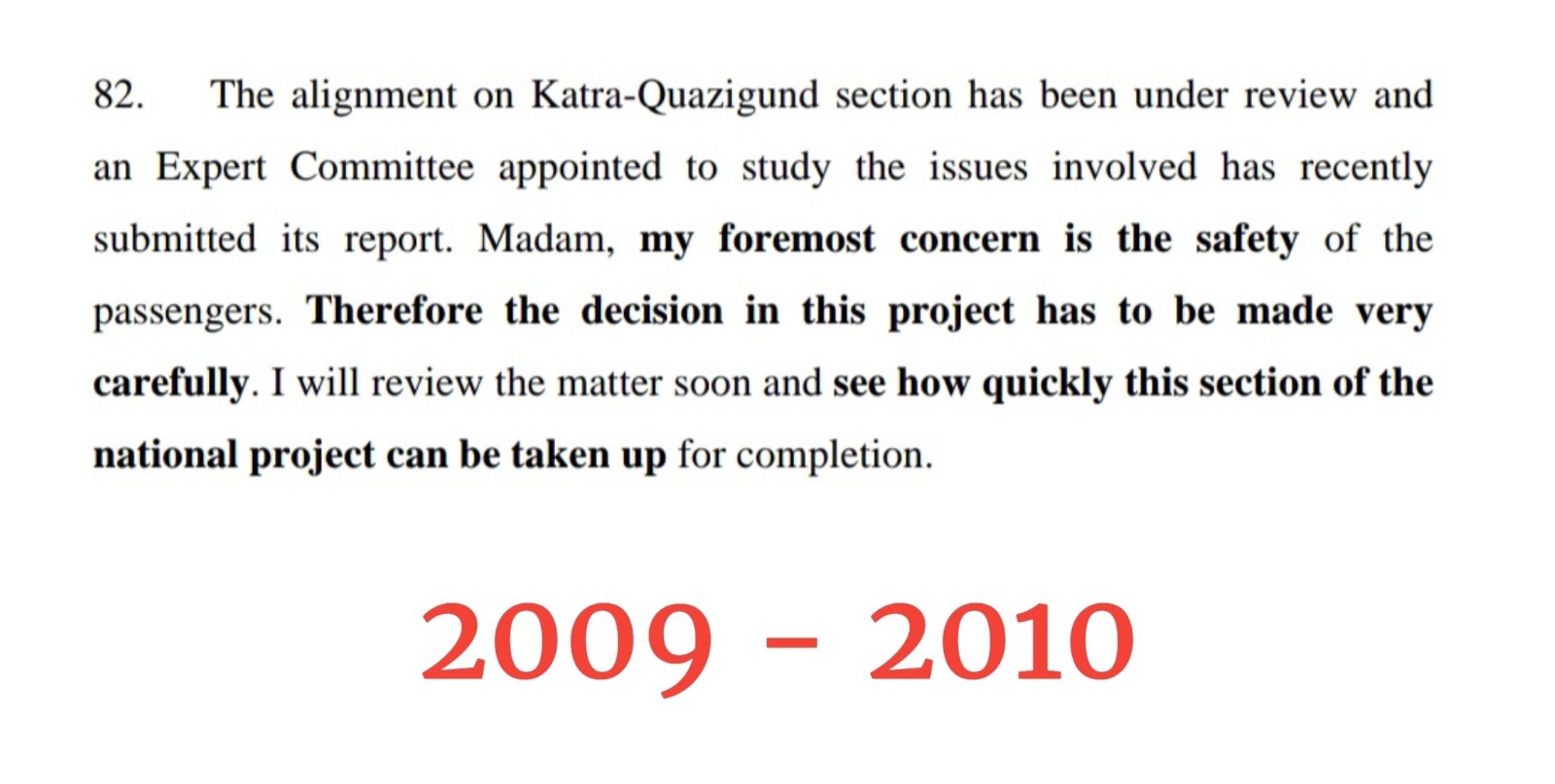 ৬. ২০০৯ সালে কাটরা-কাজিগুন্ড সেকশনের উদ্বোধন এবং বিশেষজ্ঞ কমিটি পাঠিয়েছিলেন রেলমন্ত্রী মমতা বন্দ্যোপাধ্যায়।