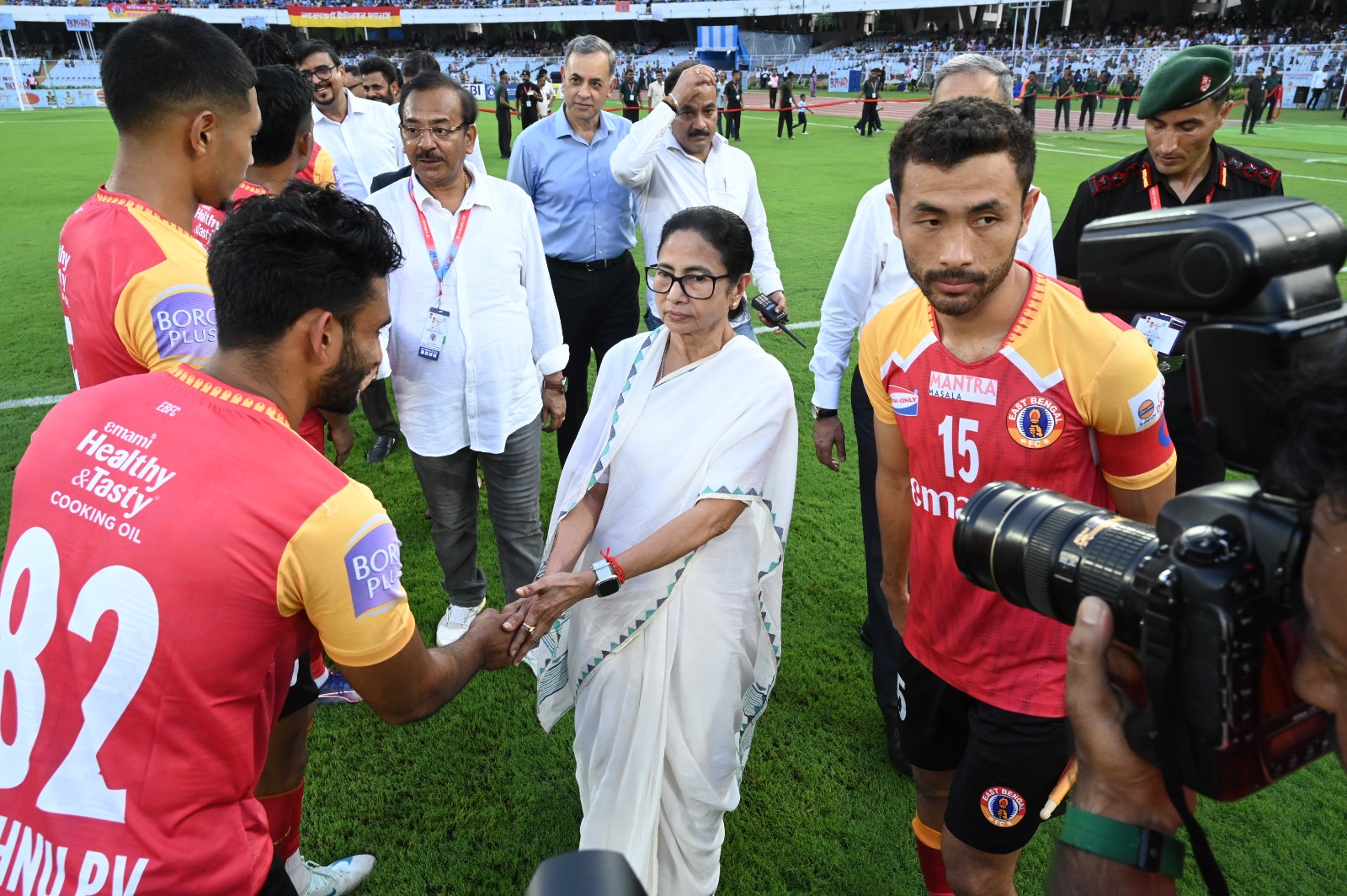 অনুষ্ঠান শেষেই মাঠে আসেন ইস্টবেঙ্গল (Eastbengal) এবং সাউথ ইউনাইটে এফসির ফুটবলাররা। তাদের সঙ্গেই পরিচয় পর্ব সারেন মুখ্যমন্ত্রী মমতা বন্দ্যোপাধ্যায় (Mamata Banerjee) এবং ক্রীড়ামন্ত্রী অরূপ বিশ্বাস। এরপরই ডুরান্ড উদ্বোধনের সেই দীর্ঘ অপেক্ষার মুহূর্ত। মুখ্যমন্ত্রীর শট দিয়েই কিকঅফ হয় এবারের ডুরান্ড কাপ। একবার নয় দুবার বলে কিক করেই ডুরান্ড কাপের উদ্বোধন করলেন তিনি।