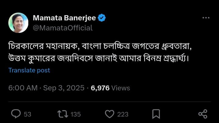 এদিন সোশ্যাল মিডিয়ায় মমতা (Mamata Banerjee) লেখেন, ‘চিরকালের মহানায়ক, বাংলা চলচ্চিত্র জগতের ধ্রুবতারা, উত্তম কুমারের জন্মদিবসে জানাই আমার বিনম্র শ্রদ্ধার্ঘ্য।’
