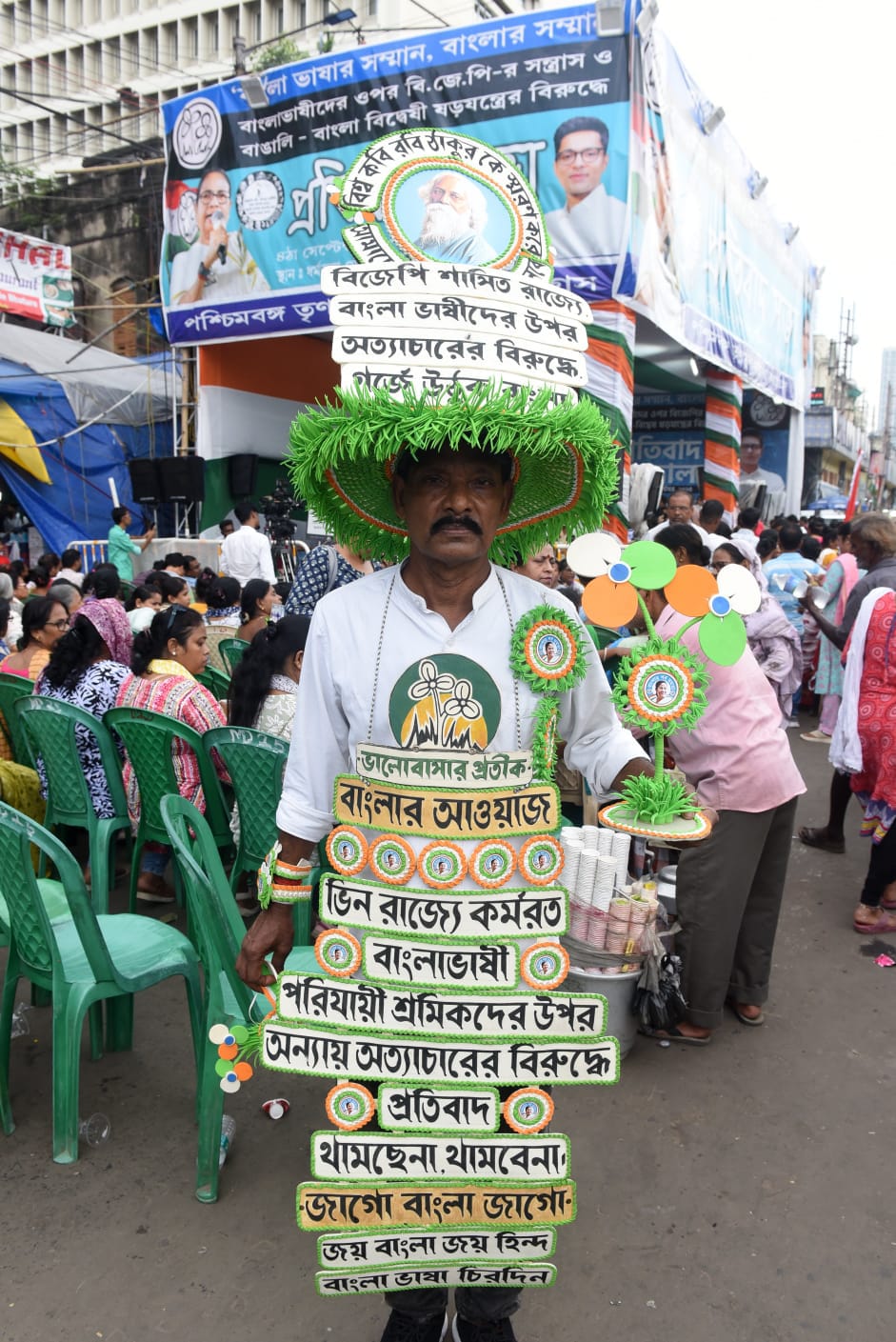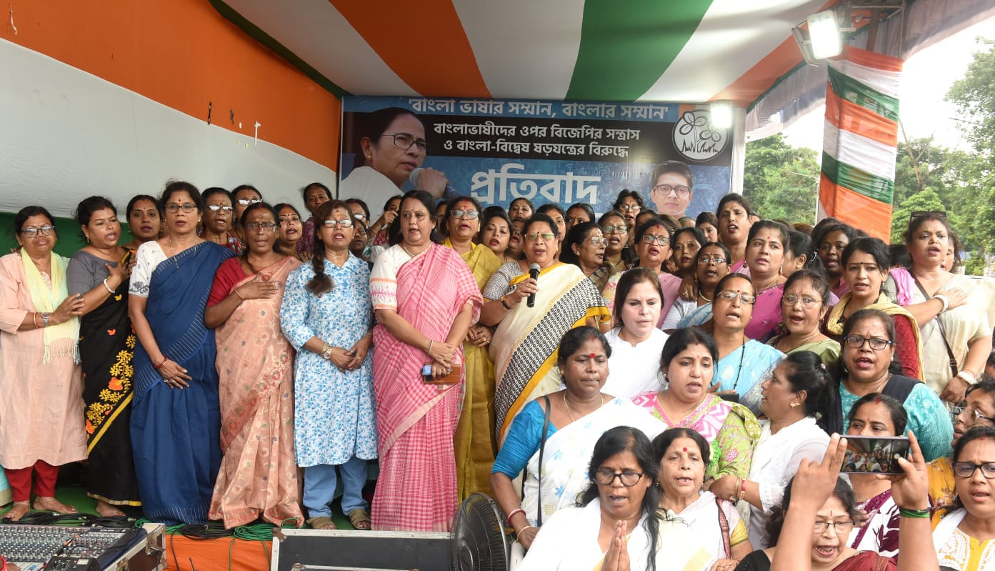 মায়ের ভাষা। বাংলাভাষা। মাতৃভাষা। আর সেই ভাষার উপরেই দেশ জুড়ে ঘৃণা-বিদ্বেষের বিষ ছড়াচ্ছে বিজেপি (BJP)। ভিনরাজ্যে কাজ করতে গিয়ে ক্রমাগত আক্রান্ত বাংলাভাষী শ্রমিকরা। রাজ্যের মুখ্যমন্ত্রী মমতা বন্দ্যোপাধ্যায়ের (Mamata Banerjee) নেতৃত্বে সেই অত্যাচারের প্রতিবাদে গর্জে উঠেছে সারা বাংলা। ধর্মতলায় ডোরিনা ক্রসিংয়ে লাগাতার চলছে প্রতিবাদ-বিক্ষোভ। সেনাকে সামনে রেখে বিজেপি মেয়ো রোডের প্রতিবাদ-মঞ্চ খুলে দেওয়ার পরই নেত্রী মমতা বন্দ্যোপাধ্যায়ের নির্দেশে ডোরিনা ক্রসিংয়ে লাগাতার প্রতিবাদ-বিক্ষোভে নেমেছে দল। শুক্রবার শিক্ষক দিবসে সেই ধর্না কর্মসূচির দায়িত্বে ছিল রাজ্য তৃণমূল মহিলা কংগ্রেস। সংগঠনের সভানেত্রী চন্দ্রিমা ভট্টাচার্যের (Chandrima Bhattacharya) নেতৃত্বে ভাষাসন্ত্রাস ও বিজেপির বাংলা-বিদ্বেষী