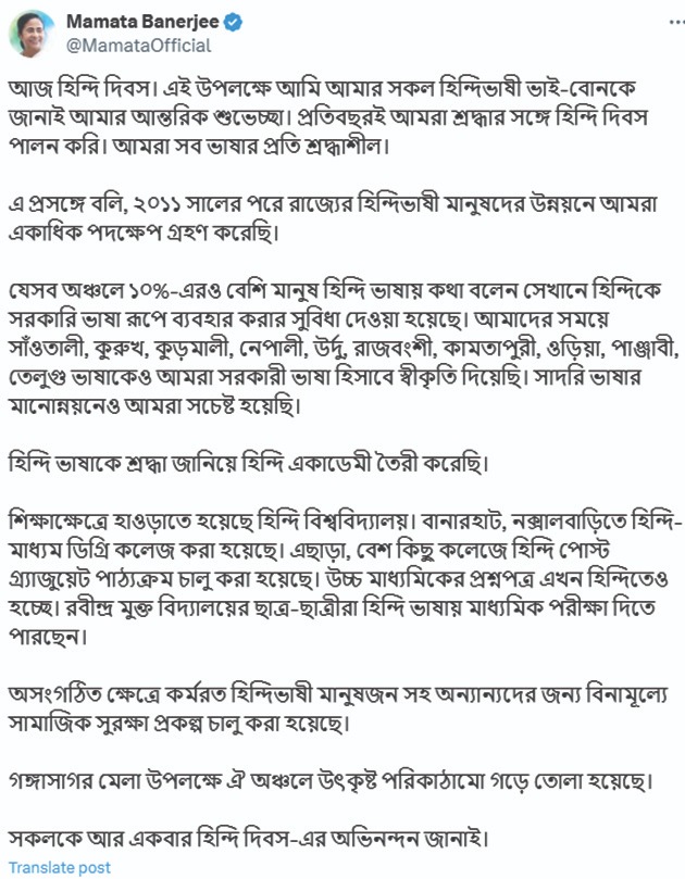 রবিবার নিজের সোশ্যাল হ্যান্ডেলে তিনি লেখেন, ‘আজ হিন্দি দিবস। আমি আমার সকল হিন্দিভাষী ভাই-বোনকে জানাই আন্তরিক শুভেচ্ছা। প্রতিবছরই আমরা শ্রদ্ধার সঙ্গে হিন্দি দিবস পালন করি। আমরা সব ভাষার প্রতি শ্রদ্ধাশীল। এ-প্রসঙ্গে বলি, ২০১১ সালের পরে রাজ্যের হিন্দিভাষী মানুষদের উন্নয়নে আমরা একাধিক পদক্ষেপ গ্রহণ করেছি।’