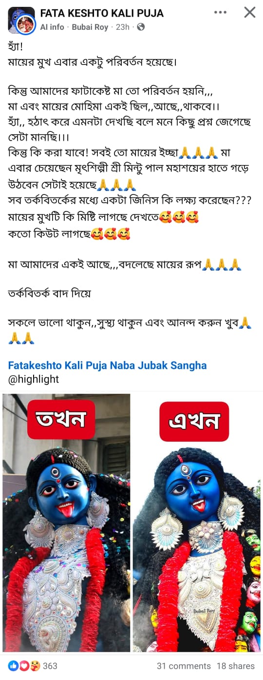 এবারের পুজোয় প্রতিমার দৈর্ঘ্য কিছুটা বেড়েছে, সেই পরিবর্তনই একমাত্র লক্ষণীয় বলে জানান তিনি। তাঁর কথায়, “উৎসবটা আনন্দের, তাই নেতিবাচক প্রচারে গা ভাসিয়ে নয়, ইতিবাচক মন নিয়ে মায়ের কাছে আসুন।” সেই সঙ্গে তিনি পুরোনো কথা ভুলে গিয়ে ফাটাকেষ্ট কালীপুজোর প্রাক্তন মৃৎশিল্পী মাধব পালকেও স্বপরিবারে তাঁদের পুজো দেখতে আসার আহ্বান জানান।