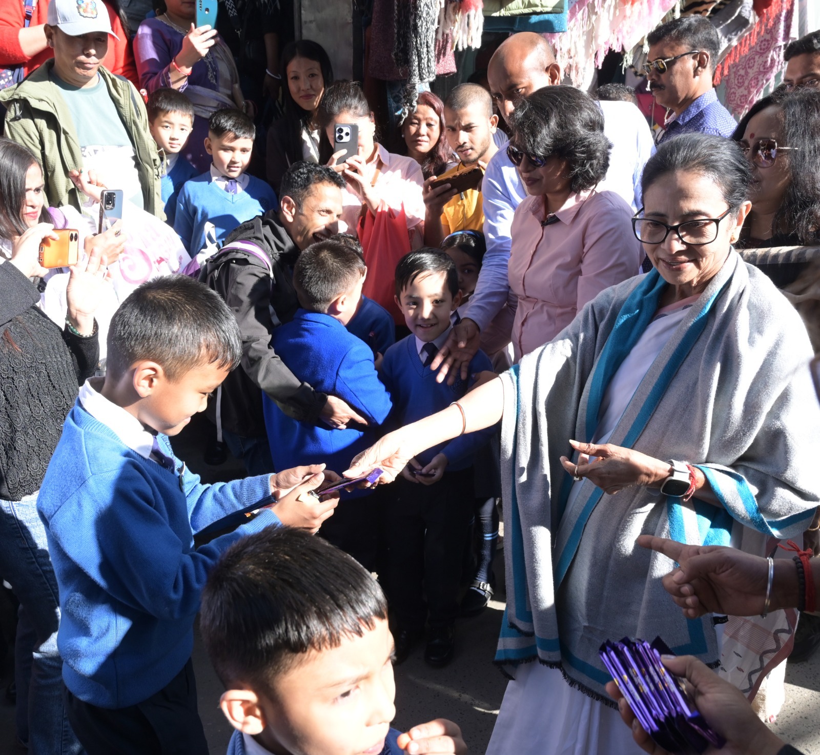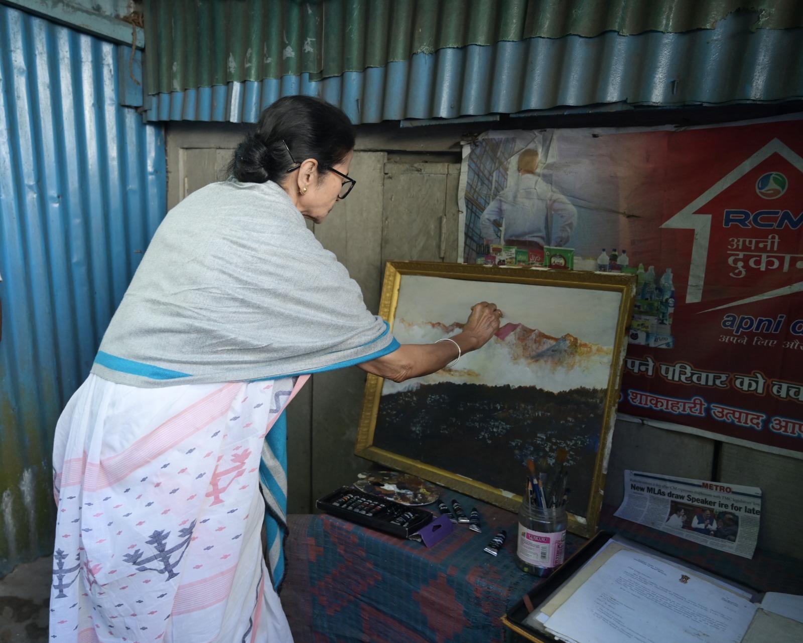 পথে রাজ্যের প্রশাসনিক প্রধানের সঙ্গে দেখা হয় স্কুল পড়ুয়াদের। তাদের হাতে চকোলেট তুলে দেন তিনি। বৈঠক সেরে ফেরার পথে এক জায়গায় রং-তুলি-ক্যানভাস (Colour, Brush, Canvas) দেখে দাঁড়িয়ে পড়েন মমতা। নিজেই হাতে তুলে নেন ব্রাশ। ক্যানভাসে ফুটিয়ে তোলেন পর্বতশৃঙ্গ। মুগ্ধ স্থানীয়রা।