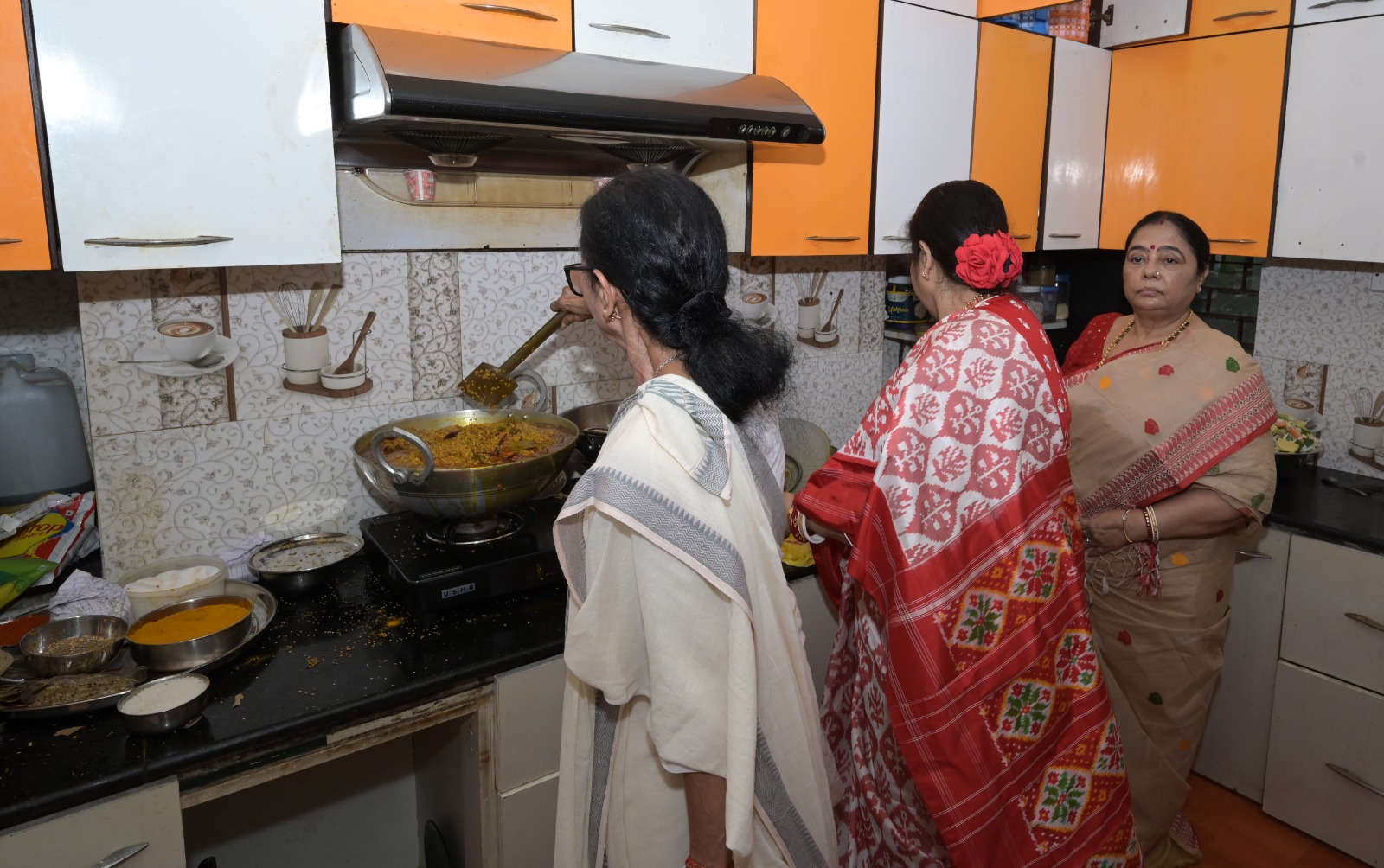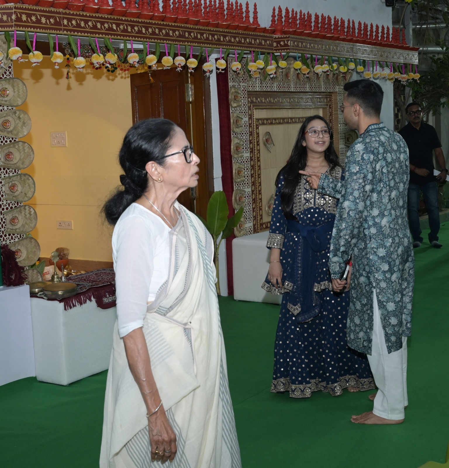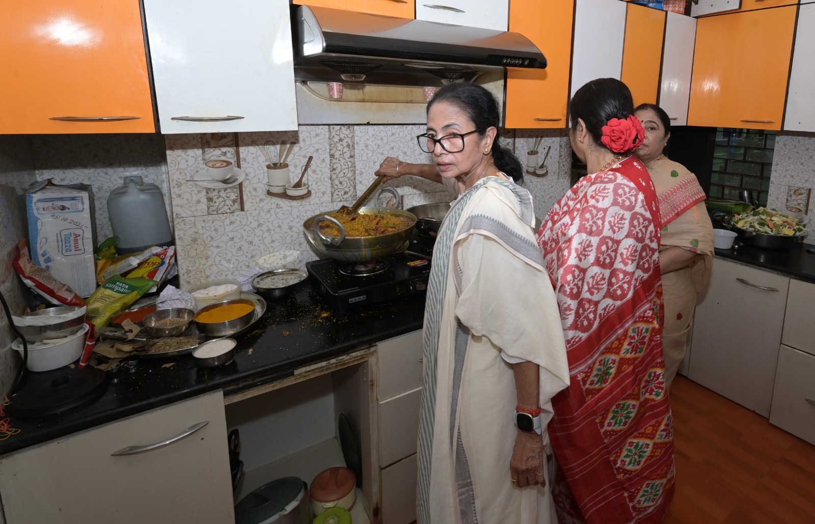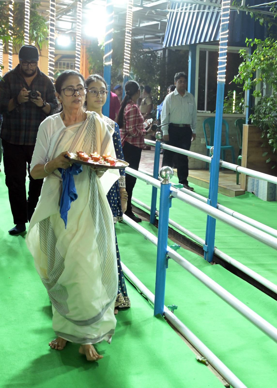 প্রতি বছরই কালীপুজোর সন্ধেয় বাড়ির সর্বত্র প্রদীপ জ্বালান মুখ্যমন্ত্রী। এবারও থালায় প্রদীপ সাজিয়ে বিভিন্ন কোণায় সেই দীপ প্রজ্জ্বলন করেন। রাঁধেন ঠাকুরের ভোগ। বড় কড়াইয়ে অনায়াস ভঙ্গীতে চালান খুন্তি।
