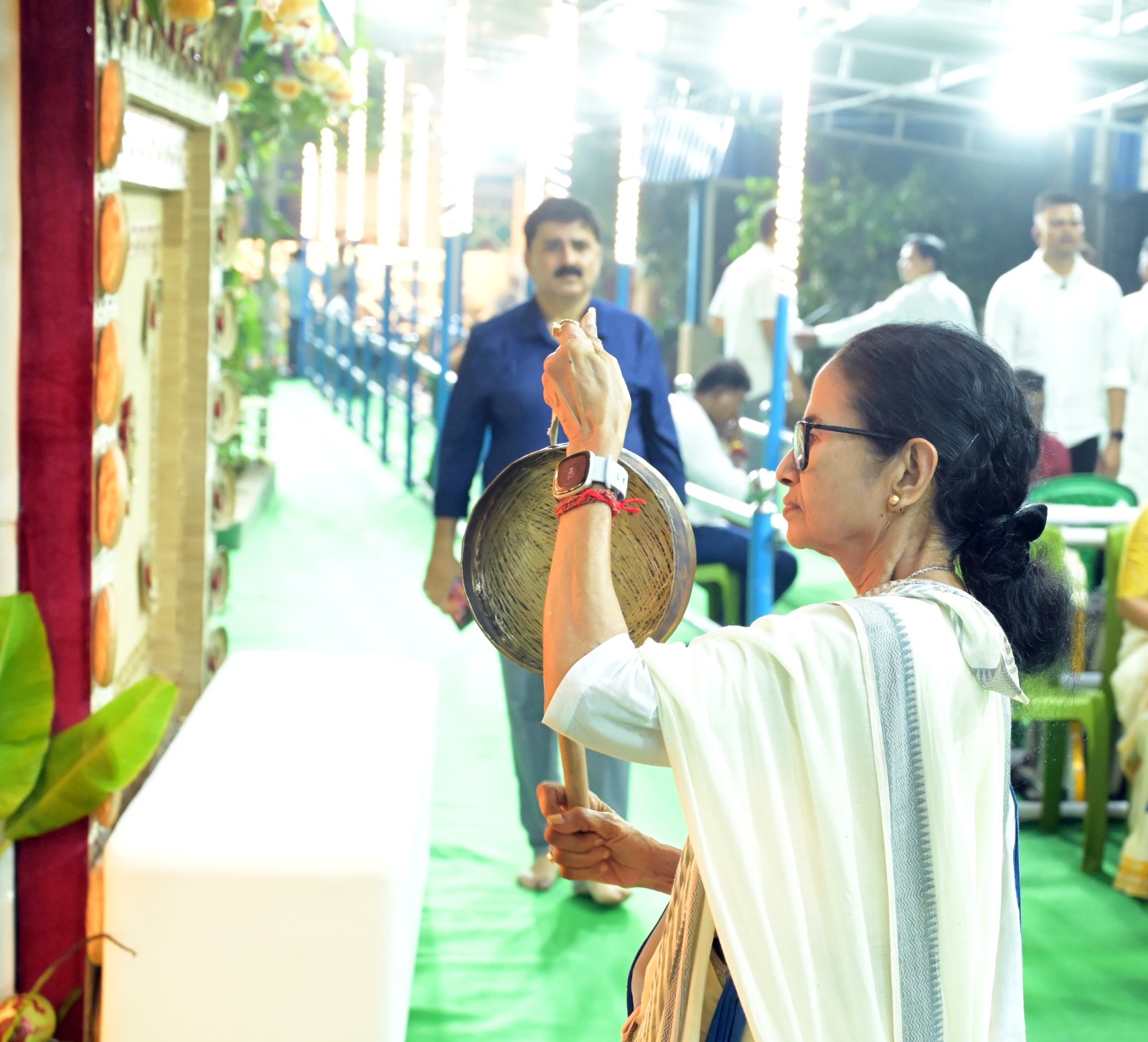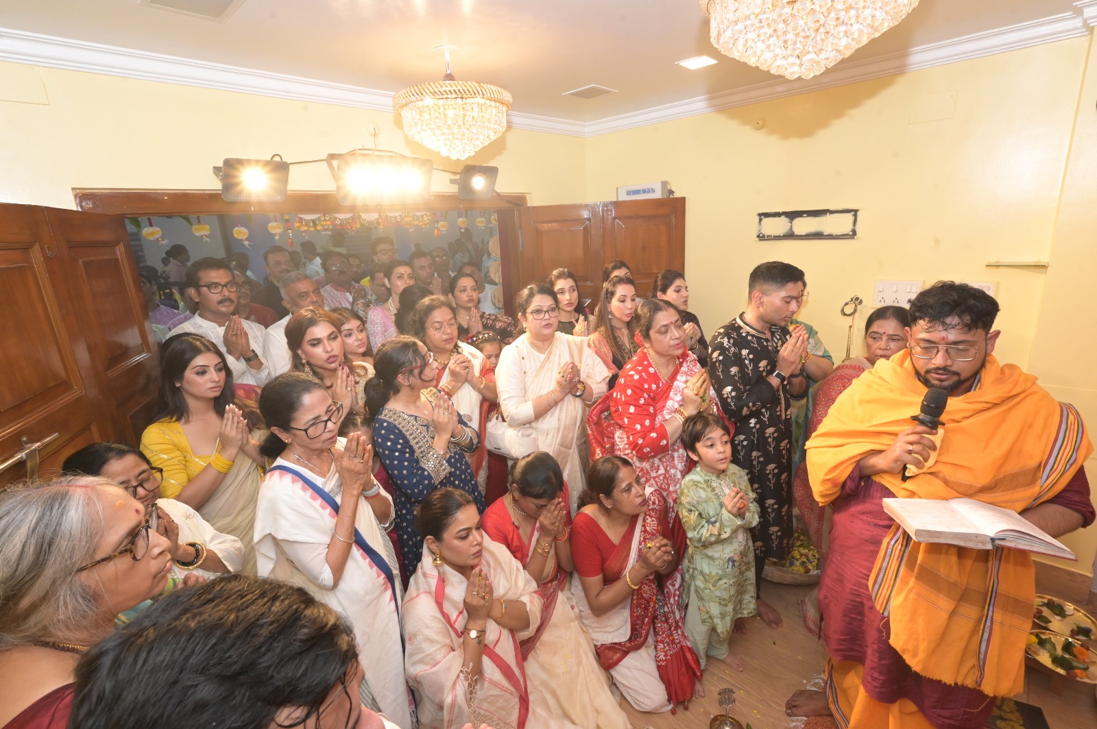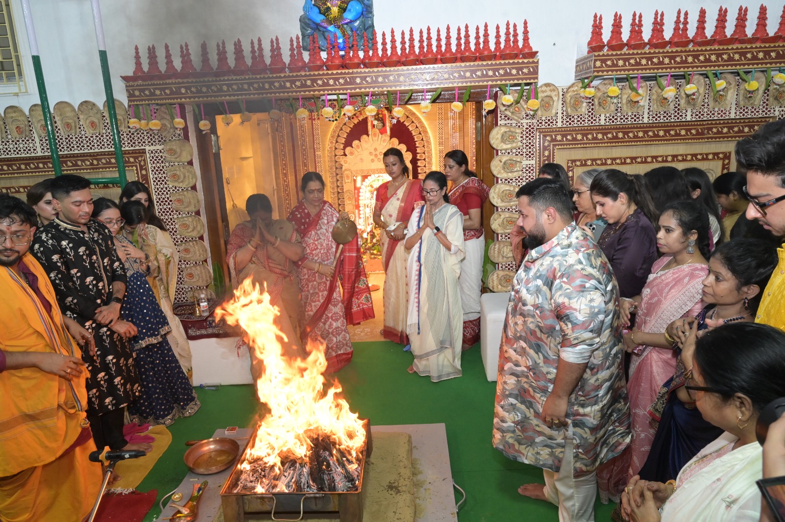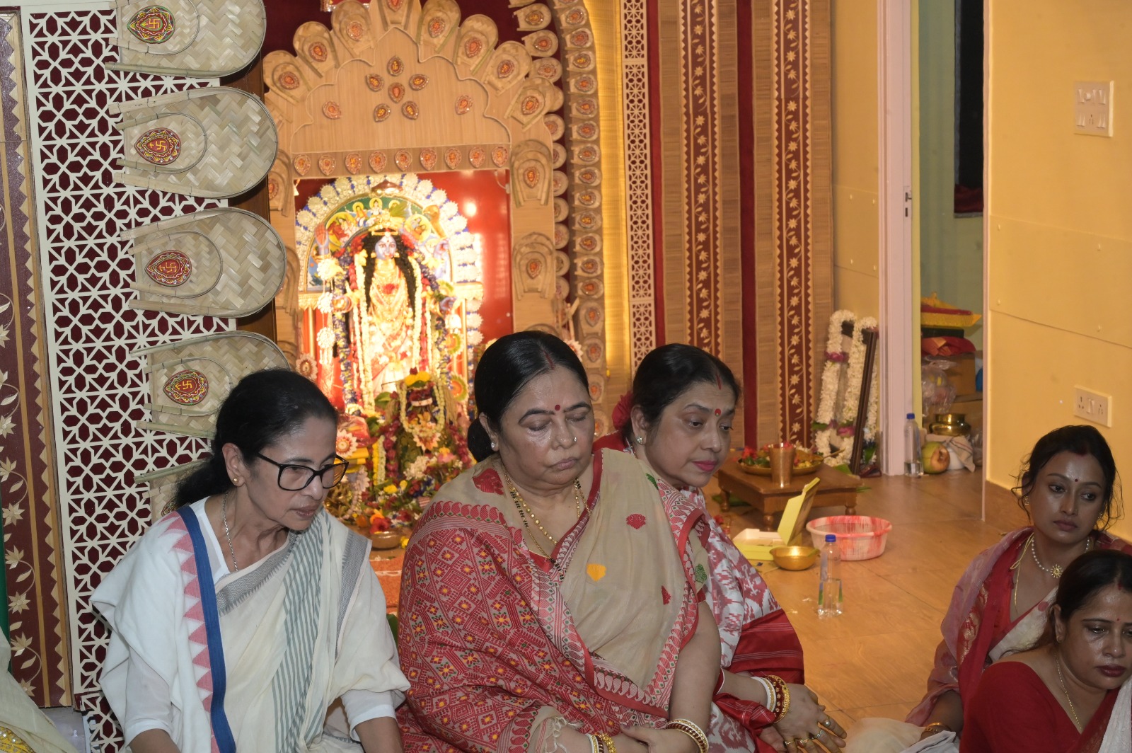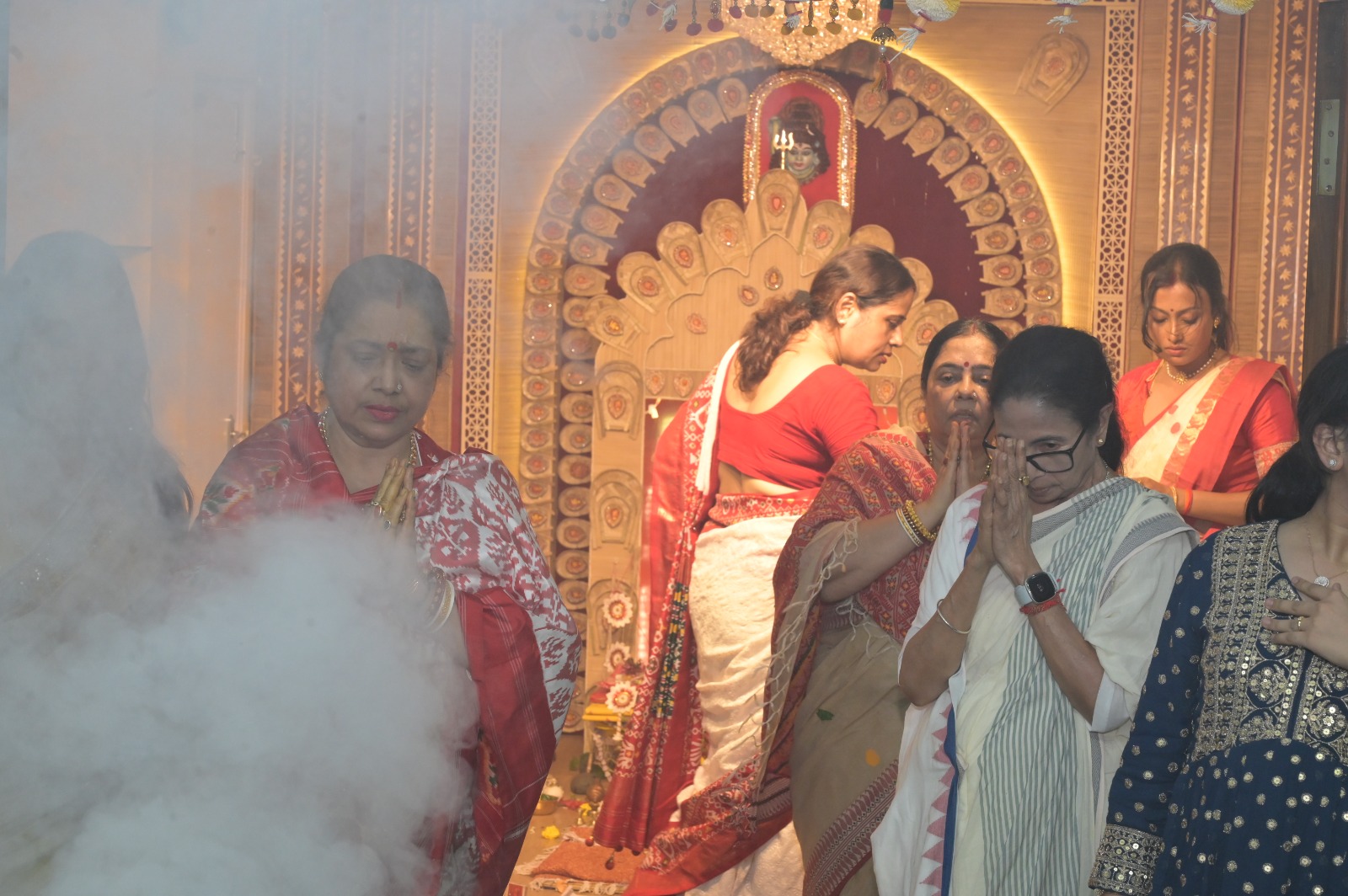 মমতা বন্দ্যোপাধ্যায়ের কালীঘাটের বাড়ির পুজোয় প্রতিবারই উপস্থিত হন রাজ্যের মন্ত্রী, নেতা, আমলা এবং সাংস্কৃতিক জগতের বিশিষ্টরা। এবারও সেই দৃশ্য চোখে পড়ে। পুজো শুরুর সময়ে দুই অভিনেত্রী জনপ্রতিনিধি জুন মালিয়া, সায়ন্তিকা বন্দ্যোপাধ্যায়কে ডেকে নেন মমতা। ছিলেন রাজ্যের মুখ্যসচিব মনোজ পন্থ, স্বরাষ্ট্রসচিব নন্দিনী চক্রবর্তী, প্রাক্তন মুখ্যসচিব হরিকৃষ্ণ দ্বিবেদী-সহ অন্যান্য আমলারা। শত ব্যস্ততার মধ্যেও তাদের সঙ্গে কুশল বিনিময় করেন মুখ্যমন্ত্রী উপস্থিত দর্শনার্থীদের কাছে পৌঁছে দেন। আরতির পঞ্চ প্রদীপ।