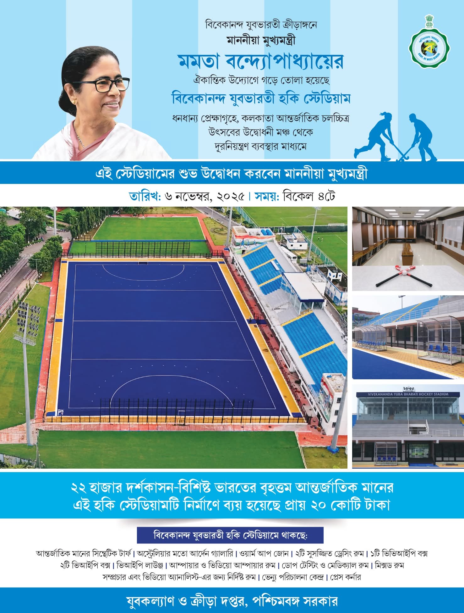 চলচ্চিত্র উৎসবের মঞ্চ থেকেই ভার্চুয়ালি বিবেকানন্দ যুবভারতী হকি স্টেডিয়ামের উদ্বোধন করবেন মুখ্যমন্ত্রী। ২২ হাজার দর্শকাসন বিশিষ্ট ভারতের মধ্যে বৃহত্তম আন্তর্জাতিক মানের এই স্টেডিয়াম নির্মাণে খরচ হয়েছে প্রায় ২০ কোটি টাকা।
