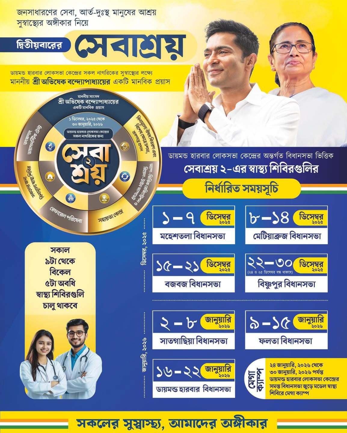 ডায়মন্ড হারবার লোকসভা কেন্দ্রের সকল নাগরিকের সেবার্থে আবারও শুরু হচ্ছে ‘সেবাশ্রয় ২’। ১ ডিসেম্বর, ২০২৫ থেকে ‘সেবাশ্রয় ২’-এর স্বাস্থ্য শিবিরগুলি চলবে ২২ জানুয়ারি ২০২৬ পর্যন্ত। ২৪ জানুয়ারি থেকে ৩০ জানুয়ারি, ২০২৬ পর্যন্ত ডায়মন্ড হারবার লোকসভা কেন্দ্রের সমস্ত বিধানসভা জুড়ে চলবে মেগা ক্যাম্প। স্বাস্থ্য শিবিরগুলি সকাল ৯টা থেকে বিকেল ৫টা পর্যন্ত চালু থাকবে। সাধারণ মানুষের সেবা এবং আর্ত-দুঃস্থ মানুষের আশ্রয় – এই আদর্শকে পাথেয় করেই দ্বিতীয়বারের ‘সেবাশ্রয়’ ফিরছে আপনাদের জন্য। সকলের সুস্বাস্থ্য, আমাদের অঙ্গীকার।’