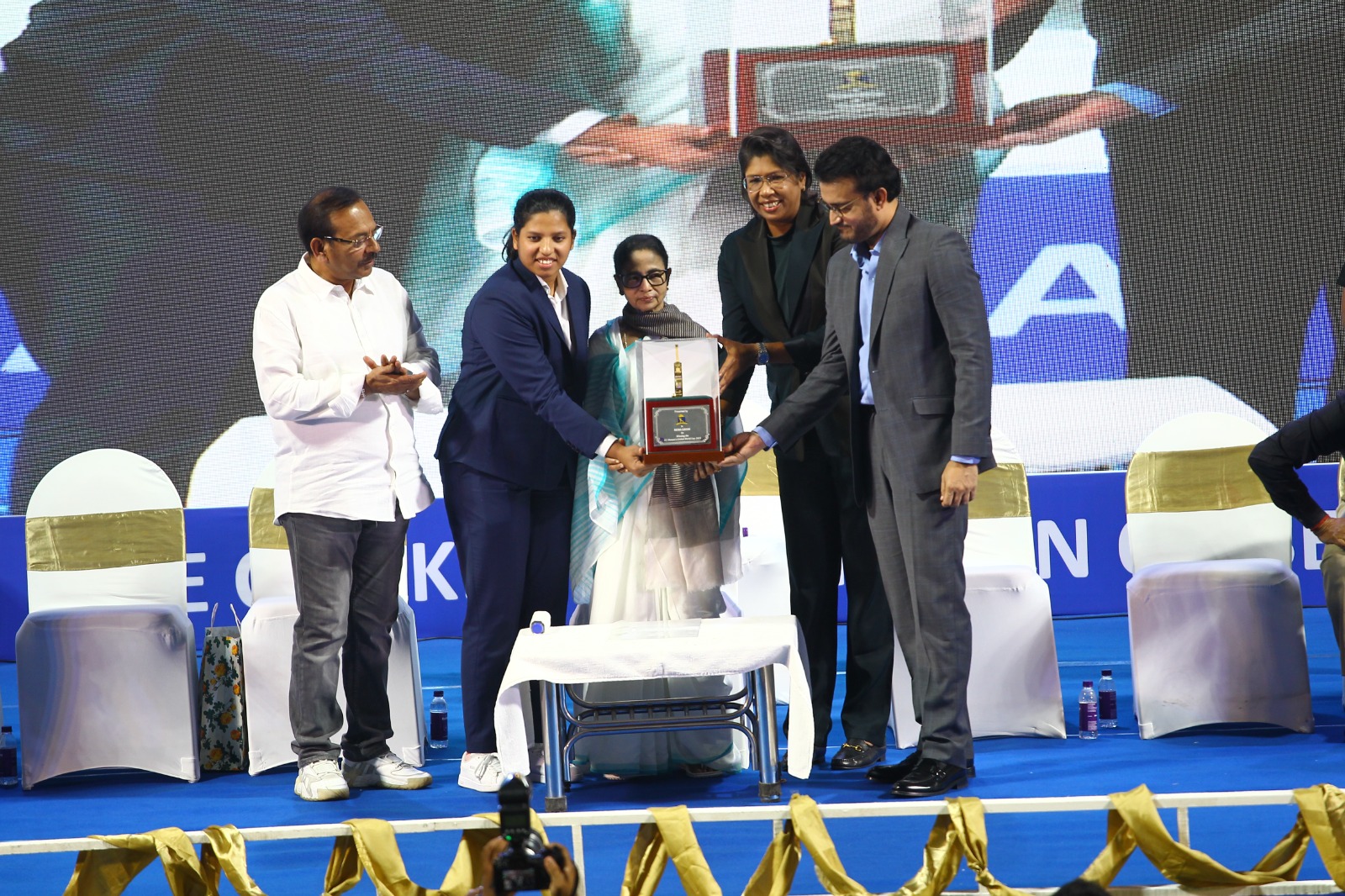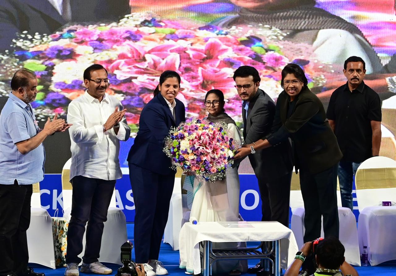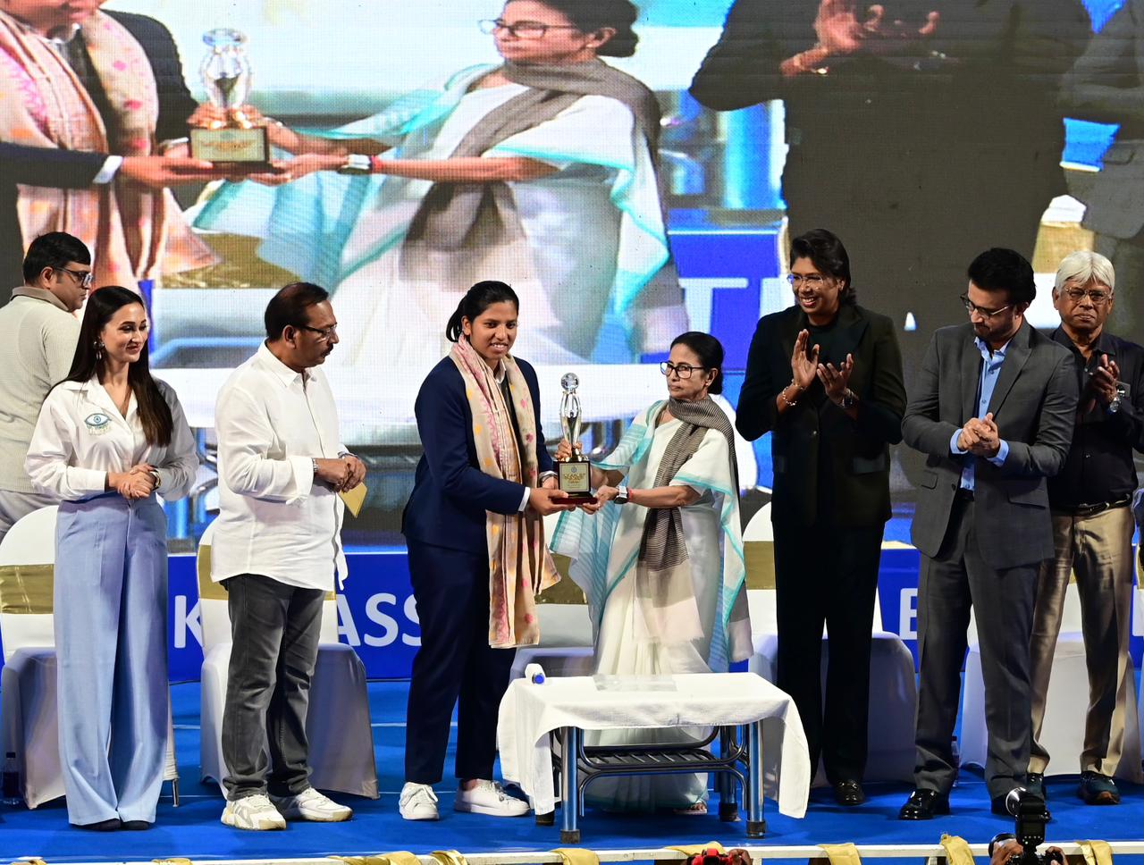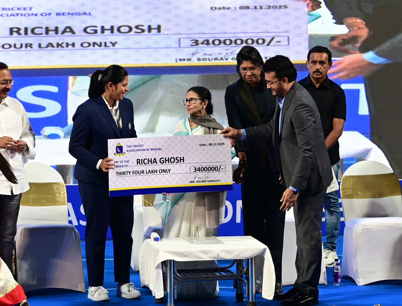 উষ্ণ অভিনন্দন। আমি চাই একনম্বর (ক্যাপ্টেন) হোক রিচা। বিশ্বজয়ী ভারতীয় মহিলা ক্রিকেটদলের সদস্য বাংলার মেয়ে রিচা ঘোষের (Richa Ghosh) সংবর্ধনায় এই মন্তব্য মুখ্যমন্ত্রী মমতা বন্দ্যোপাধ্যায়ের (Mamata Banerjee)। রাজ্যের তরফে সোনার মেয়ে রিচাকে বঙ্গভূষণ সম্মান দেওয়া হয়। রিচার হাতে রাজ্য পুলিশের DSP-র চাকরির নিয়োগপত্র দেন মুখ্যমন্ত্রী। গলায় পরিয়ে দেন সোনার হার। শনিবার, ইডেন গার্ডেনস-এ রিচার সংবর্ধনায় CAB-র তরফে ৩৪ লক্ষ টাকা ও সোনার ব্যাট-বল দেওয়া হয়।