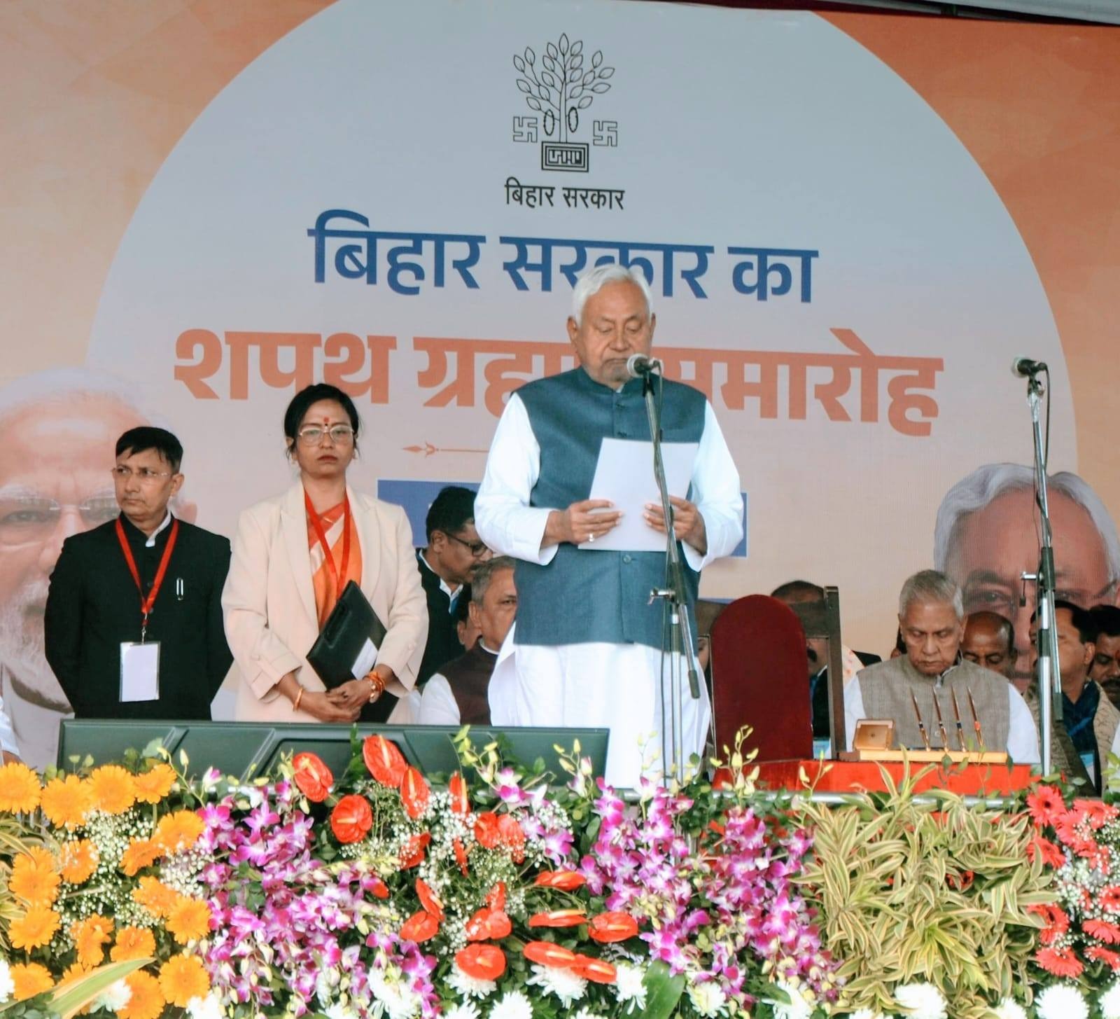 এদিন সকাল সাড়ে ১১টা নাগাদ শপথগ্রহণ অনুষ্ঠান শুরু হয়। ২৫ বছরে দশমবারের জন্য বিহারের মুখ্যমন্ত্রী পদে শপথ নিলেন নীতীশ কুমার। শপথগ্রহণের পর মঞ্চেই তাঁকে শুভেচ্ছা জানান প্রধানমন্ত্রী। নীতীশ কুমারের বিদায়ী সরকারের উপমুখ্যমন্ত্রী সম্রাট চোধরী ও বিজয় সিনহাই ফের এবার উপমুখ্যমন্ত্রী হিসেবে শপথ নিয়েছেন। একই সঙ্গে সম্রাট চৌধুরী বিহার বিজেপির সংসদীয় দলনেতা এবং বিজয় সিনহা উপদলনেতা হিসেবে নির্বাচিত হয়েছেন।