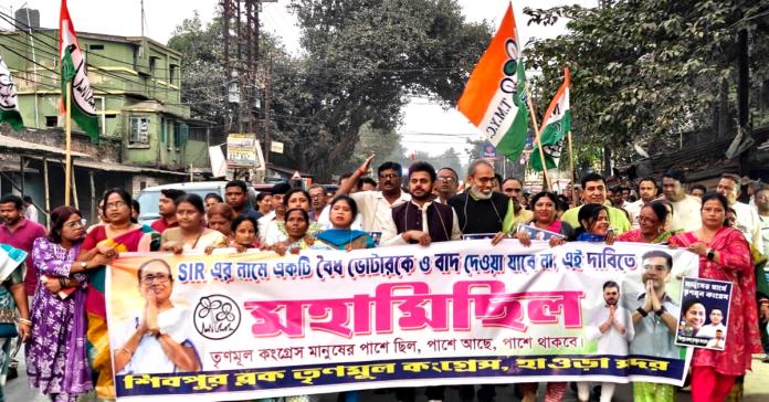 SIR প্রক্রিয়ায় যাতে একটিও বৈধ ভোটার বাদ না যান, সেই দাবিকে কেন্দ্র করে এবং SIR নিয়ে বিজেপির “চক্রান্ত”-এর বিরুদ্ধে সরব হয়ে শিবপুর ব্লক তৃণমূল কংগ্রেসের উদ্যোগে আয়োজিত হল প্রতিবাদ মিছিল ও পথসভা। শিবপুরের মাননীয় বিধায়ক তথা ক্রীড়া ও যুব কল্যাণ প্রতিমন্ত্রী মনোজ তিওয়ারির আহ্বানে বুধবার দাশনগর পেট্রোল পাম্প থেকে বালিটিকুরি মুক্তারাম দে হাই স্কুল পর্যন্ত মিছিল অনুষ্ঠিত হয়।