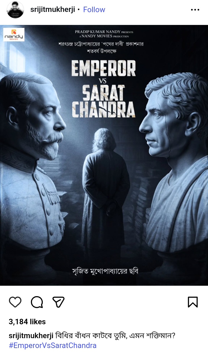 ‘লহ গৌরাঙ্গের নাম রে’ সিনেমার প্রমোশনের মাঝেই নতুন ছবির ঘোষণা করলেন পরিচালক সৃজিত মুখোপাধ্যায় (Srijit Mukherji)। চৈতন্য জীবনলীলার মাহাত্ম্য বড়পর্দায় সকলকে দেখানোর পাশাপাশি এবার কথা সাহিত্যিকের বিখ্যাত উপন্যাস ‘পথের দাবী’ অবলম্বনে আগামী ছবি ‘এম্পারার ভার্সেস শরৎচন্দ্র’ (Emperor vs Sarat Chandra) ছবির প্রস্তুতি শুরু করে দিলেন জাতীয় পুরস্কার প্রাপ্ত পরিচালক। নিজের সোশ্যাল মিডিয়া পেজে এই ছবিটা একটি পোস্টার আপলোড করেছেন সৃজিত। তবে চমক কাস্টিংয়ে। শোনা যাচ্ছে এই প্রথমবার মিমি চক্রবর্তীর (Mimi Chakraborty)সঙ্গে কাজ করবেন তিনি। থাকছেন আবির চট্টোপাধ্যায় (Abir Chatterjee) ও টোটা রায়চৌধুরীও (Tota Roychowdhury)।