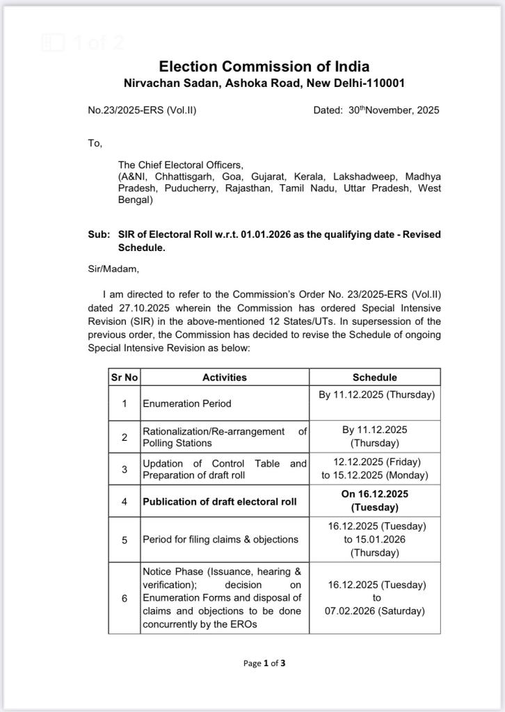 কমিশনের তরফে প্রথমে খসড়া ভোটার তালিকা প্রকাশের দিন ৯ ডিসেম্বর ঠিক করা হয়েছিল। কিন্তু এবার সেটা পিছিয়ে ১৬ ডিসেম্বর করা হয়েছে। এদিকে চূড়ান্ত ভোটার তালিকা (final voter list) ঘোষণা হওয়ার দিন ঠিক ছিল ৭ ফেব্রুয়ারি, যেটা আপাতত পিছিয়ে ১৪ ফেব্রুয়ারি হল। দেশের যে ১২টি রাজ্য ও কেন্দ্র শাসিত অঞ্চলের ক্ষেত্রে ২৭ অক্টোবর বিজ্ঞপ্তি জারি করেছিল কমিশন, সেই সব জায়গার জন্যই এই নতুন বিজ্ঞপ্তি জারি হল।