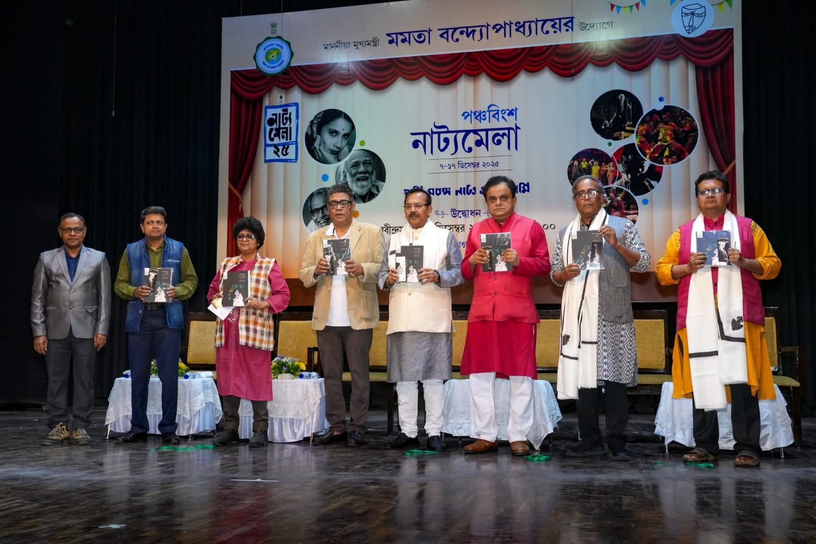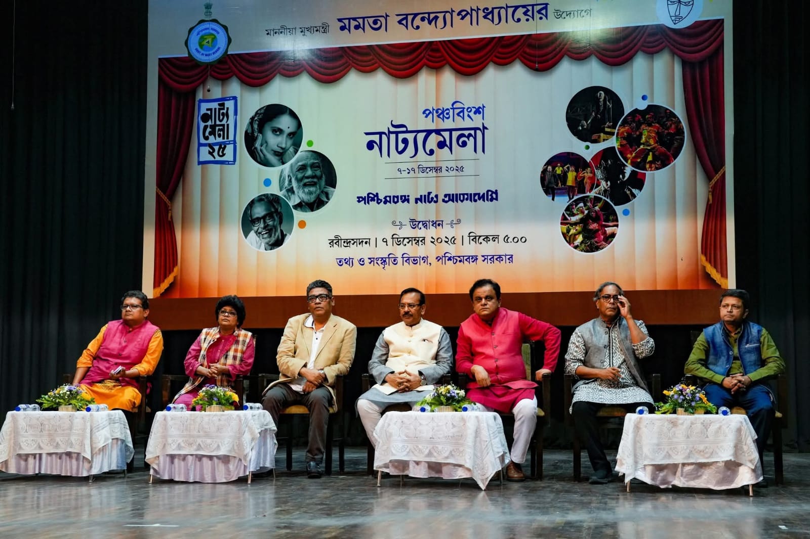 রবিবার সন্ধ্যায় কলকাতার রবীন্দ্রসদনে পশ্চিমবঙ্গ নাট্য আকাদেমির উদ্যোগে শুরু হলো ২৫তম নাট্যমেলা। উদ্বোধনী অনুষ্ঠানে উপস্থিত ছিলেন রাজ্যের তিন মন্ত্রী—ইন্দ্রনীল সেন, অরূপ বিশ্বাস এবং ব্রাত্য বসু। অনুষ্ঠানে আরও উপস্থিত ছিলেন নাট্য আকাদেমির সভাপতি দেবশঙ্কর হালদার, অভিনেত্রী ও প্রাক্তন সাংসদ অর্পিতা ঘোষ, নাট্যব্যক্তিত্ব কৌস্তুব তরফদার এবং শান্তনু চক্রবর্তী। মঞ্চে ছিলেন নাট্য জগতের বিশিষ্ট ব্যক্তিত্বরাও। মঞ্চে তাঁদের বক্তব্যে উঠে এসেছে রাজ্যের নাট্যচর্চার বিস্তার, শিল্পীদের পরিশ্রম এবং নাট্যমেলাকে আরও বৃহৎ পরিসরে পৌঁছে দেওয়ার প্রয়াস। বিশেষভাবে উল্লেখযোগ্য দুটি নাম—তথ্য ও সংস্কৃতি দপ্তরের আধিকারিক কৌস্তভ তরফদার এবং নাট্য আকাদেমির সচিব শান্তনু চক্রবর্তী। নাট্যমেলা আয়োজনের নেপথ্যের পরিকল্পনা, শ্রম ও নিষ্ঠার জন্য তাঁদের প্রশংসা করেন অতিথিরা।