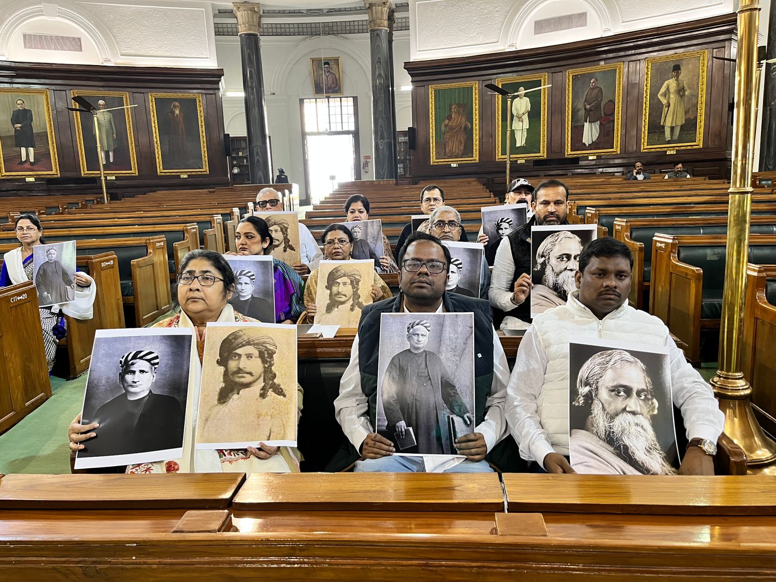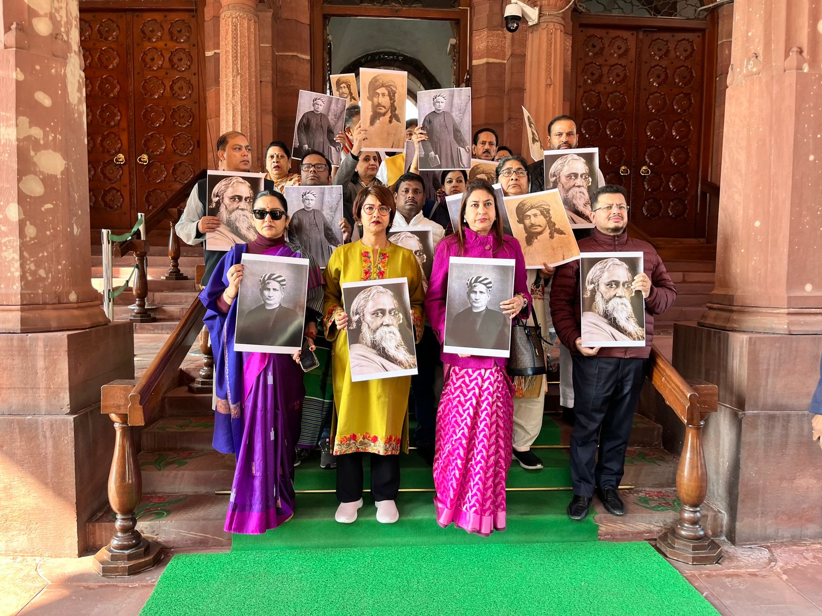 বন্দেমাতরমের দেড়শ বছর নিয়ে আলোচনায় সোমবার সংসদে সাহিত্য সম্রাটকে “বঙ্কিম দা” বলে অসম্মান-অপমান করেছেন নরেন্দ্র মোদি। এদিন পার্লামেন্টের সেন্ট্রাল হলে শতাব্দী রায় (Shatabdi Roy), রচনা বন্দ্যোপাধ্যায় (Rachana Banerjee), ঋতব্রত বন্দ্যোপাধ্যায় (Ritabrata Bandopadhyay), সাগরিকা ঘোষ , মহুয়া মৈত্র (Mahua Moitra), জুন মালিয়া, ডেরেক ও ব্রায়েন, দোলা সেন (Dola Sen), কীর্তি আজাদ-সহ তৃণমূলের প্রায় সব সাংসদদের দেখা গেল বিশ্বকবি ও সাহিত্য সম্রাটের ছবি হাতে মৌন প্রতিবাদ জানাতে।