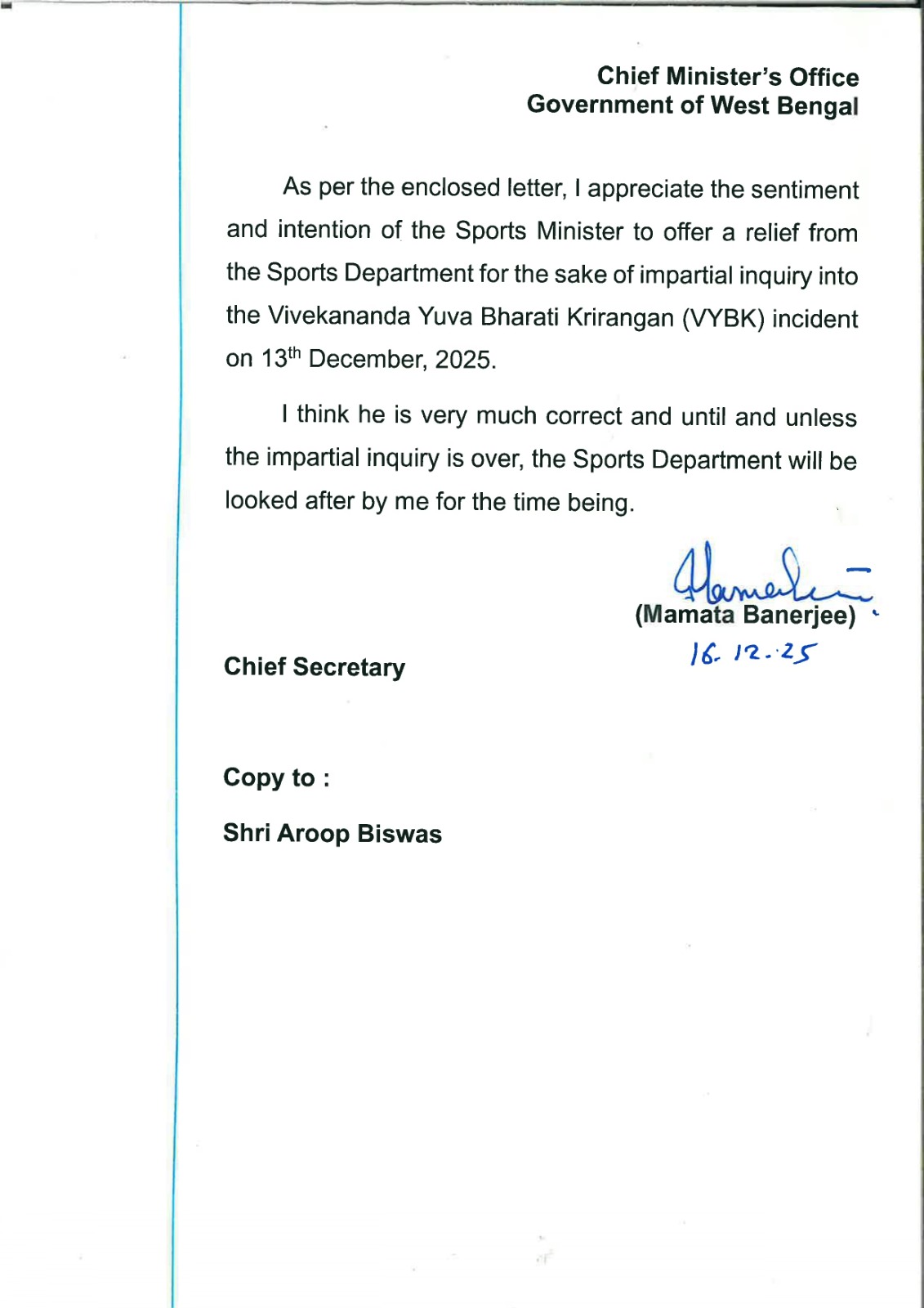 অরূপের সেই ইচ্ছাকে মান্যতা দিয়ে তদন্ত শেষ না পর্যন্ত তাঁকে ক্রীড়া দফতরের দায়িত্ব থেকে অব্যাহতি দেন মুখ্যমন্ত্রী (Mamata Banerjee)। চিঠিতে তিনি লেখেন, “১৩ ডিসেম্বর বিবেকানন্দ যুব ভারতী ক্রীড়াঙ্গনের ঘটনার নিরপেক্ষ তদন্তের স্বার্থে ক্রীড়া দফতরের দায়িত্ব থেকে ক্রীড়ামন্ত্রীর অব্যাহতি চাওয়ার ইচ্ছাকে আমি প্রশংসা করি। আমি মনে করি তিনি একেবারে সঠিক। যতক্ষণ না নিরপেক্ষ তদন্ত শেষ হচ্ছে, ততক্ষণ পর্যন্ত ক্রীড়া দফতর আমিই সামলাব।“ তবে, অরূপ বিদ্যুৎ দফতরের মন্ত্রী পদে বহাল থাকছেন।
