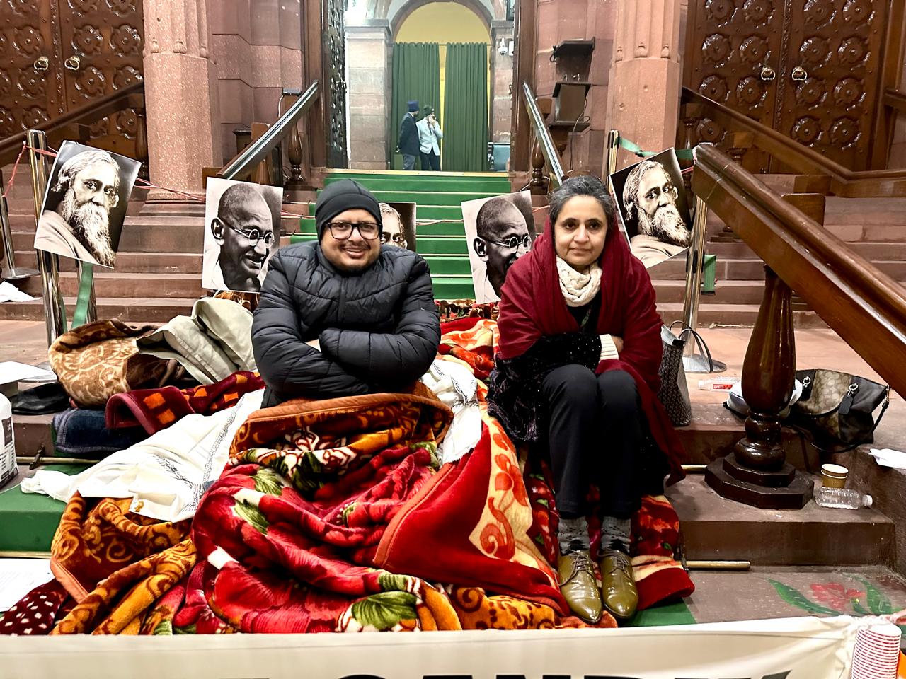 ব্যাপক ঠান্ডা দিল্লিতে (Delhi)। এর মধ্যেই ‘জি রাম জি’ বিলের বিরোধিতায় পুরোনো সংসদ ভবনের সিঁড়িতে রাতভর ধর্নায় তৃণমূল সাংসদরা (TMC MP’s protest)। শুক্রবার সকালেও চলছে প্রতিবাদ। মহাত্মা গান্ধী এবং বাঙালিকে অপমানের প্রতিবাদে আগামী ১২ ঘণ্টা ধর্না দেবেন সাংসদরা। তৃণমূল কংগ্রেসের সঙ্গে ধর্নায় ছিল কংগ্রেস এবং ডিএমকে-সহ অন্যান্য সাংসদরাও। রবীন্দ্রনাথ ঠাকুর এবং মহাত্মা গান্ধীর ছবির সামনে বসে ধর্নায় সাংসদ ঋতব্রত বন্দ্যোপাধ্যায় (Ritabrata Banerjee), সাগরিকা ঘোষ (Sagarika Ghosh), মমতাবালা ঠাকুর, দোলা সেন (Dola Sen), প্রকাশ চিক বরাইক, নাদিমূল হক, সুস্মিতা দেব (Sushmita Deb), সাকেত গোখলেরা।