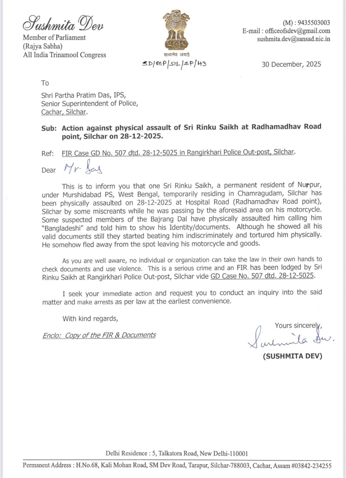 আক্রান্ত এই যুবকের পাশে দাঁড়িয়েছেন সুস্মিতা দেব। তিনি নিজের লেটারহেডে শিলচরের পুলিশ সুপার পার্থপ্রতিম দাসকে চিঠি লিখেছেন সেখানে পুরো ঘটনার বিবরণ দিয়ে রিঙ্কুর করা জিডির উল্লেখ করেছেন। সুস্মিতা দ্রুত আইনানুগ পদক্ষেপ করারও দাবি জানিয়েছেন। রিঙ্কুরা জানান, ভিন রাজ্যে তৃণমূলই পাশে দাঁড়িয়েছে তাঁদের। নিরাপদ আশ্রয় রেখেছে। এবং সুস্মিতা দেব নিজে বিমানের টিকিট কেটে তাঁদের বাড়ি ফেরার ব্যবস্থা করে দিয়েছেন। তার জন্য কৃতজ্ঞ রিঙ্কুরা।