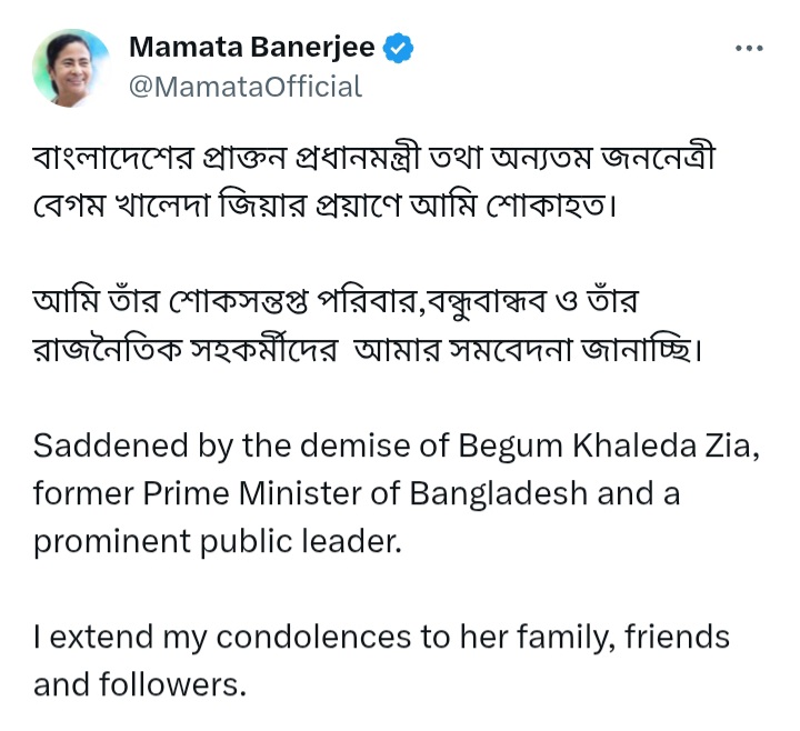 বাংলার মুখ্যমন্ত্রী মমতা বন্দ্যোপাধ্যায় লেখেন, ‘বাংলাদেশের প্রাক্তন প্রধানমন্ত্রী তথা অন্যতম জননেত্রী বেগম খালেদা জিয়ার প্রয়াণে আমি শোকাহত। আমি তাঁর শোকসন্তপ্ত পরিবার, বন্ধুবান্ধব ও তাঁর রাজনৈতিক সহকর্মীদের আমার সমবেদনা জানাচ্ছি।’