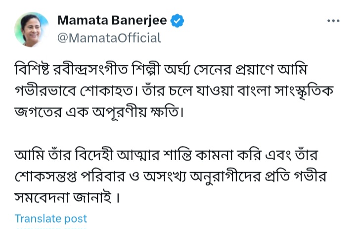 বাংলার সাংস্কৃতিক জগতে নক্ষত্রপতন। বুধের সকালে প্রয়াত কিংবদন্তি শিল্পী অর্ঘ্য সেন (Arghya Sen)। ৯০ বছর বয়সে রবীন্দ্র সংগীত সাধনার জগতে পথ চলা থামল বর্ষীয়ান শিল্পীর। খবর ছড়িয়ে পড়তেই শোকস্তব্ধ সঙ্গীত মহল। সমাজমাধ্যমে শোকবার্তা পোস্ট করেছেন বাংলার মুখ্যমন্ত্রী মমতা বন্দ্যোপাধ্যায় (Mamata Banerjee)।