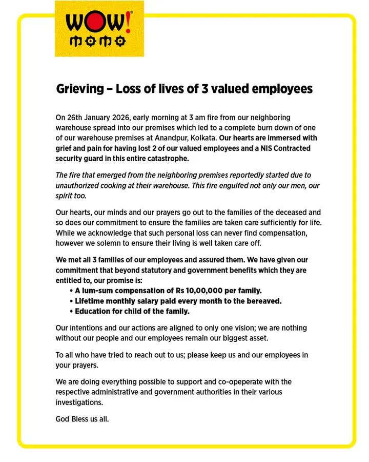 সূত্রের খবর, উদ্ধার হওয়া ২১টি দেহাংশের পরিচয় নিশ্চিত করতে আজ থেকেই ডিএনএ ম্যাপিংয়ের (DNA Mapping) কাজ শুরু হতে পারে। দেহ সনাক্ত হয়ে গেলেই পরিবারের হাতে তা তুলে দেওয়া হবে।ভয়াবহ এই অগ্নিকাণ্ডের প্রায় ৬০ ঘণ্টা পর বিবৃতি দিয়ে পাশের গোডাউনের উপর অগ্নিকাণ্ডের দায় চাপিয়েছে ওয়াও মোমো (Wow Momo)। বলা হয়েছে পাশের গুদামে অনুমোদনহীন ভাবে রান্না চলছিল যেখান থেকেই এই দুর্ঘটনা ঘটে। অগ্নিকাণ্ডের ঘটনায় ওয়াও মোমো সংস্থার তিন কর্মীর মৃত্যুতে শোকপ্রকাশ করে তাঁদের পরিবারের সদস্যদের আজীবন মাসোহারা দেওয়ার আশ্বাস দেওয়া হয়েছে।