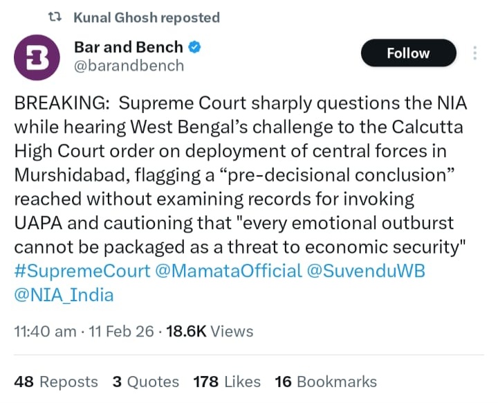 বেলডাঙায় অশান্তির ঘটনায় কেন্দ্রীয় এজেন্সির তদন্ত করা নিয়ে হাইকোর্টের নির্দেশে হস্তক্ষেপ করল না সুপ্রিম কোর্ট (Supreme Court)। তবে বেআইনি কার্যকলাপ প্রতিরোধ আইনের (UAPA) ১৫ নম্বর ধারা প্রয়োগের ব্যাপারে পর্যাপ্ত তথ্য এনআইএ-র কাছে আছে কি, কলকাতা হাইকোর্টকে (Calcutta High Court) এই বিষয়ে সিদ্ধান্ত নেওয়ার নির্দেশ দিয়েছে শীর্ষ আদালতের প্রধান বিচারপতির বেঞ্চ। এনআইএ তাদের তদন্ত সংক্রান্ত স্ট্যাটাস রিপোর্ট মুখবন্ধ খামে জমা দেবে কলকাতা হাইকোর্টে৷ এদিন বিচারপতি জয়মাল্য ভাবছি স্পষ্ট বলেন কোন আবেগের বহিঃপ্রকাশ মানেই দেশের অর্থনৈতিক কাঠামো ভেঙে পড়বে এমনটা সব ক্ষেত্রে হয় না। তাছাড়া ২০২৫ সালের এপ্রিলে মুর্শিদাবাদে অশান্তির ঘটনায় হাইকোর্টের তরফে বারবার বলা হলেও NIA মোতায়েন নিয়ে সিদ্ধান্ত নেয়নি কেন্দ্র। তাহলে বেলডাঙার ক্ষেত্রে সব তথ্য যাচাই না করে কেন কেন্দ্রীয় এজেন্সিকে ব্যবহার করা হচ্ছে এ নিয়েও প্রশ্ন তোলেন বিচারপতি বাগচী। দুটি ঘটনার ক্ষেত্রে দু’রকম অবস্থান কেন তার কোনও সদুত্তর দিতে পারিনি কেন্দ্র।