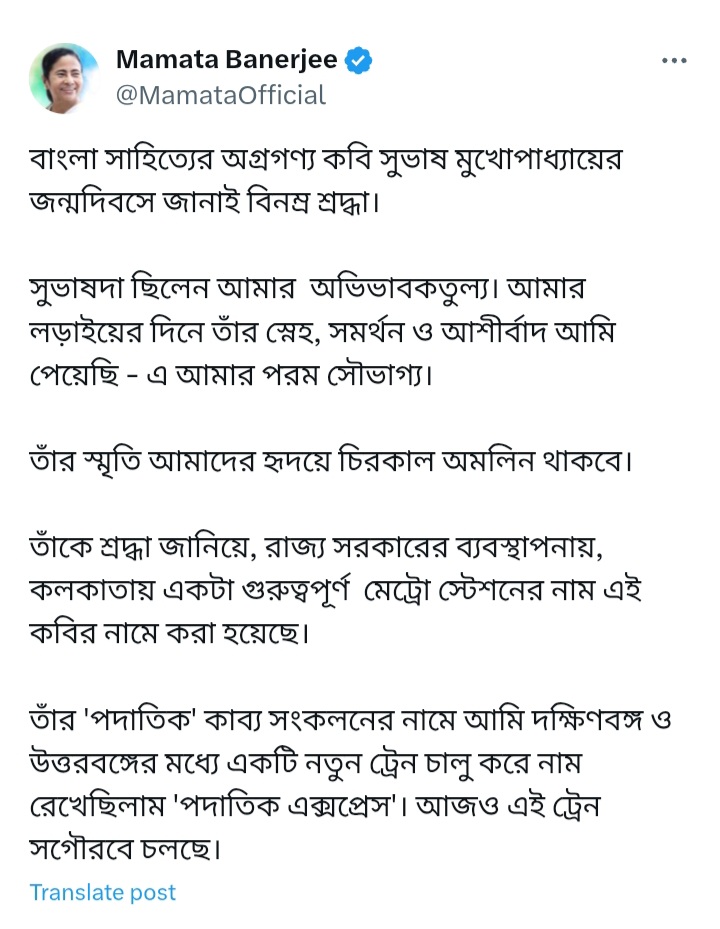 বৃহস্পতিবার কবি সুভাষের জন্মদিন উপলক্ষে মুখ্যমন্ত্রী তাঁর পোস্টে প্রাবন্ধিককে সম্মান জানিয়ে রাজ্য সরকারের তরফে কী কী পদক্ষেপ করা হয়েছে সেই বিষয়টিও তুলে ধরেন। উল্লেখ করেন পদাতিক এক্সপ্রেস ট্রেন চালুর কথাও।