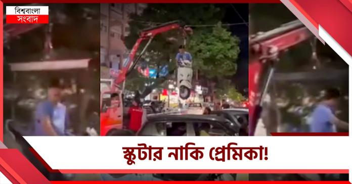 নিয়ম ভেঙে নো পার্কিং (No parking) জোনে স্কুটার (Scooty) পার্ক করেছিলেন। পুলিশ যখন সেটা বাজেয়াপ্ত করতে আসে, তখনই শুরু হলো নাটক। কিছুতেই নিজের বাহন ছাড়বেন না মালিক। প্রতিবাদ জানাতে সোজা চড়ে বসলেন স্কুটারের সিটে। শেষমেশ মালিককে বসিয়ে রেখেই ক্রেন (Crane) দিয়ে স্কুটারটিকে শূন্যে তুলে ফেলল তারা।