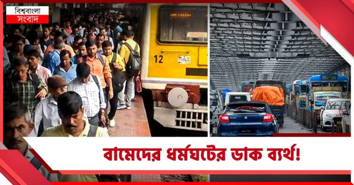বামেদের ডাকা ধর্মঘটের তেমন কোনো প্রভাব পড়ল না রাজ্য প্রশাসনের সদর দফতর থেকে শুরু করে জেলা স্তরের সরকারি অফিসগুলিতে। বৃহস্পতিবার রাজ্যের বিভিন্ন প্রান্তের সরকারি দফতরে কর্মীদের উপস্থিতির ছবিটা ছিল অন্যান্য সাধারণ দিনের মতোই স্বাভাবিক। বৃহস্পতিবার সকালে নবান্নের প্রবেশপথে সরকারি কর্মীদের লম্বা লাইন দেখা যায়। নবান্ন সূত্রের খবর, কলকাতা ও জেলা মিলিয়ে সমস্ত রাজ্য সরকারি দফতরে এ দিন কর্মীদের হাজিরার হার ছিল ৯০ শতাংশের বেশি।