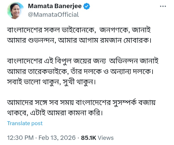 শুক্রবার সকাল থেকে ভোটের ফলাফল আসতেই দেখা যায়, ভরাডুবি হয়েছে জামাতের। ছাত্র সমাজের প্রতিও আস্থা রাখেননি সে দেশের নাগরিকরা। মহিলাদের একটা বড় অংশ সমর্থন করেছে বিএনপিকে। এদিন সকালে সোশ্যাল মিডিয়ায় পোস্ট করে বিএনপি চেয়ারপারসনকে শুভেচ্ছা জানানোর পাশাপাশি বাংলাদেশের মানুষকে আগাম রমজান মোবারক জানান মমতা। তিনি লেখেন, ‘বাংলাদেশের সকল ভাইবোনকে, জনগণকে, জানাই আমার শুভনন্দন, আমার আগাম রমজান মোবারক। বাংলাদেশের এই বিপুল জয়ের জন্য অভিনন্দন জানাই আমার তারেকভাইকে, তাঁর দলকে ও অন্যান্য দলকে। সবাই ভালো থাকুন, সুখী থাকুন। আমাদের সঙ্গে সব সময় বাংলাদেশের সুসম্পর্ক বজায় থাকবে, এটাই আমরা কামনা করি।’