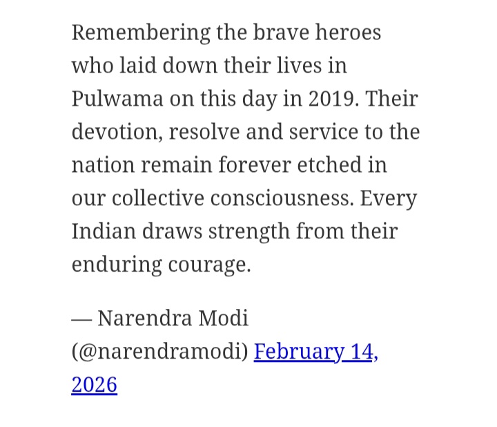 আজ থেকে সাত বছর আগে ঠিক এই দিনে জম্মু-শ্রীনগর জাতীয় সড়কে ৭৮টি গাড়ির বিশাল কনভয়ে প্রায় আড়াই হাজারের বেশি সিআরপিএফ কর্মী যাচ্ছিলেন। পুলওয়ামা জেলার লেথপোরা এলাকায় বিস্ফোরক বোঝাই একটি গাড়ি কনভয়ের বাসে সজোরে ধাক্কা মারে। ৪০ জন জওয়ান ঘটনাস্থলেই শহিদ হন, আহত হন আরও ৩৫ জনের বেশি।হামলার দায় স্বীকার করে পাকিস্তানভিত্তিক জঙ্গি সংগঠন জইশ-ই মহম্মদ (Jaish-e-Mohammed)। এই ঘটনার পর থেকে ভারত পাকিস্তান সম্পর্কের সমীকরণ বদলাতে শুরু করে। আজ আরও এক ১৪ ফেব্রুয়ারি। যেদিন সকালে সোশ্যাল মিডিয়ায় পোস্ট করে মোদি লেখেন, ২০১৯ সালের এই দিনে পুলওয়ামায় যাঁরা দেশের জন্য প্রাণ উৎসর্গ করেছিলেন, তাঁদের সাহস ও কর্তব্যনিষ্ঠা জাতির চেতনায় চিরস্থায়ী হয়ে রয়েছে। প্রত্যেক ভারতীয় তাঁদের অদম্য সাহস থেকে শক্তি সঞ্চয় করেন।জওয়ানদের আত্মবলিদানের কথার স্মরণ করে।