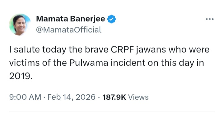 সোশ্যাল মিডিয়ায় পোস্ট করে শহিদ জওয়ানদের স্যালুট জানিয়েছেন বাংলার মুখ্যমন্ত্রী মমতা বন্দ্যোপাধ্যায়।