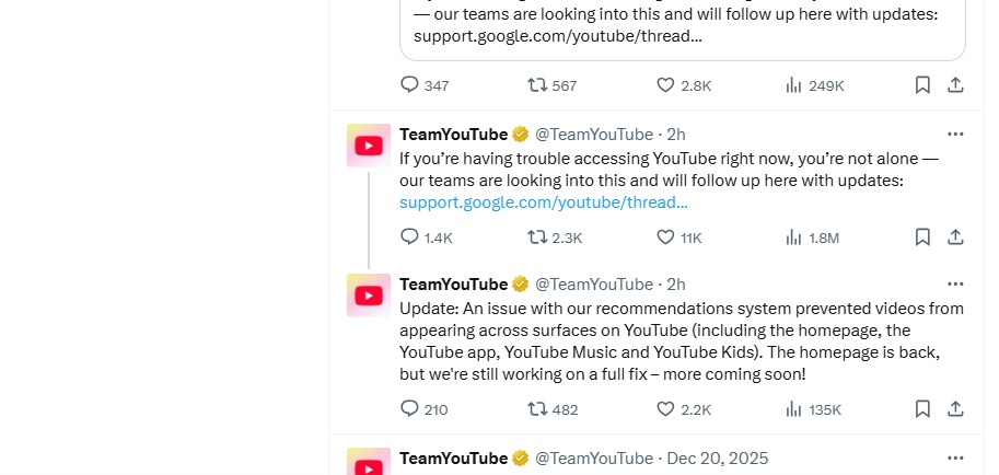 বুধের সকালে হঠাৎ বিপত্তি। ইউটিউব স্ক্রিনে দেখা গেল ভিডিও চালাতে আচমকাই ভেসে উঠলো ‘Something Went Wrong’ লেখা। কোথাও আবার ভিডিয়ো চলতে চলতে বন্ধ হয়ে গেল। বুধবার সকালে লক্ষাধিক YouTube ব্যবহারকারী এমনই সমস্যার সম্মুখীন হলেন। জানা গেল গোটা বিশ্বে অন্তত ২,৮০,০০০ ইউ টিউব ব্যবহারকারী এই সমস্যায় পড়েছেন। ঠিক কী কারণে পরিষেবা বন্ধ হল সেটা যদিও এখনও জানা যায়নি। যারা ইউটিউবের মোবাইল অ্যাপলিকেশন ব্যবহার করেন, তাঁরাই এই সমস্যার সম্মুখীন হয়েছেন। তবে, YouTube-এর ওয়েবসাইট এবং YouTube TV-তেও সমস্যা হয়েছে বলে জানা গিয়েছে। প্রায় ৭,০০০ মানুষ টিভিতেও সমস্যার সম্মুখীন হয়েছে। সমস্যাটি আমেরিকাতে হলেও, ইংল্যান্ড, ভারত-সহ বেশ কয়েকটি দেশের মানুষ এই সমস্যায় পড়েছেন। সকাল সাড়ে ছ’টা থেকে সাড়ে সাতটার মধ্যে প্রায় ১৬ শতাংশ মানুষ এই সমস্যায় পড়েছেন। অন্যদিকে ৭৪ শতাংশ মানুষ অ্যাপে লগইন করতে পারেননি।