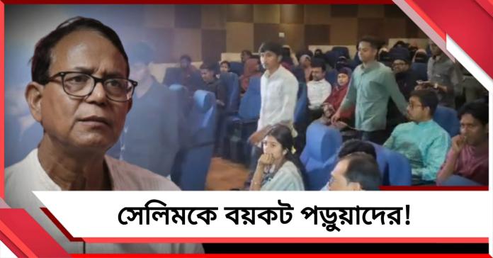 পার্ক সার্কাসের আলিয়া বিশ্ববিদ্যালয় ক্যাম্পাসে তখন চলছে ‘সামাজিক সাম্য ও সংখ্যালঘুর অধিকার’ নিয়ে আলোচনা। মঞ্চে বক্তব্য রাখছেন ভাঙড়ের বিধায়ক নওশাদ সিদ্দিকি। কিন্তু হঠাৎই তাল কাটল সিপিএমের রাজ্য সম্পাদক মহম্মদ সেলিমের উপস্থিতিতে। তিনি মঞ্চে পা রাখতেই অডিটোরিয়ামের ভেতরে শুরু হলো শোরগোল। সেলিম বক্তব্য শুরু করতে না করতেই তাঁর উপস্থিতির প্রতিবাদে কার্যত সভা ‘বয়কট’ করে বেরিয়ে গেলেন পড়ুয়াদের এক বড় অংশ। পরিস্থিতি এমন পর্যায়ে পৌঁছল যে, ভরা অডিটোরিয়াম মুহূর্তেই ফাঁকা হতে শুরু করে।