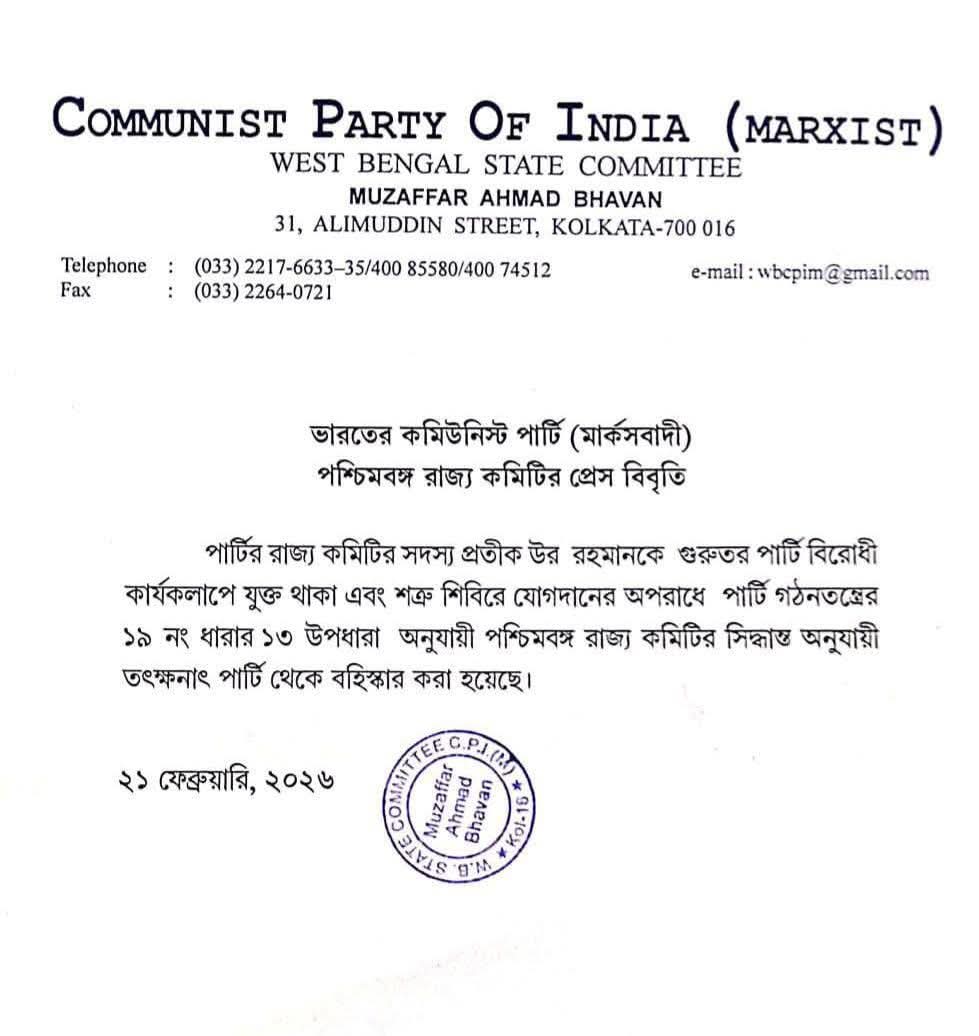 “পার্টির রাজ্য কমিটির সদস্য প্রতীক উর রহমানকে গুরুতর পার্টি বিরোধী কার্যকলাপে যুক্ত থাকা এবং শত্রু শিবিরে যোগদানের অপরাধে পার্টি গঠনতন্ত্রের ১৯ নং ধারার ১৩ উপধারা অনুযায়ী পশ্চিমবঙ্গ রাজ্য কমিটির সিদ্ধান্ত অনুযায়ী তৎক্ষনাৎ পার্টি থেকে বহিস্কার করা হয়েছে।“
