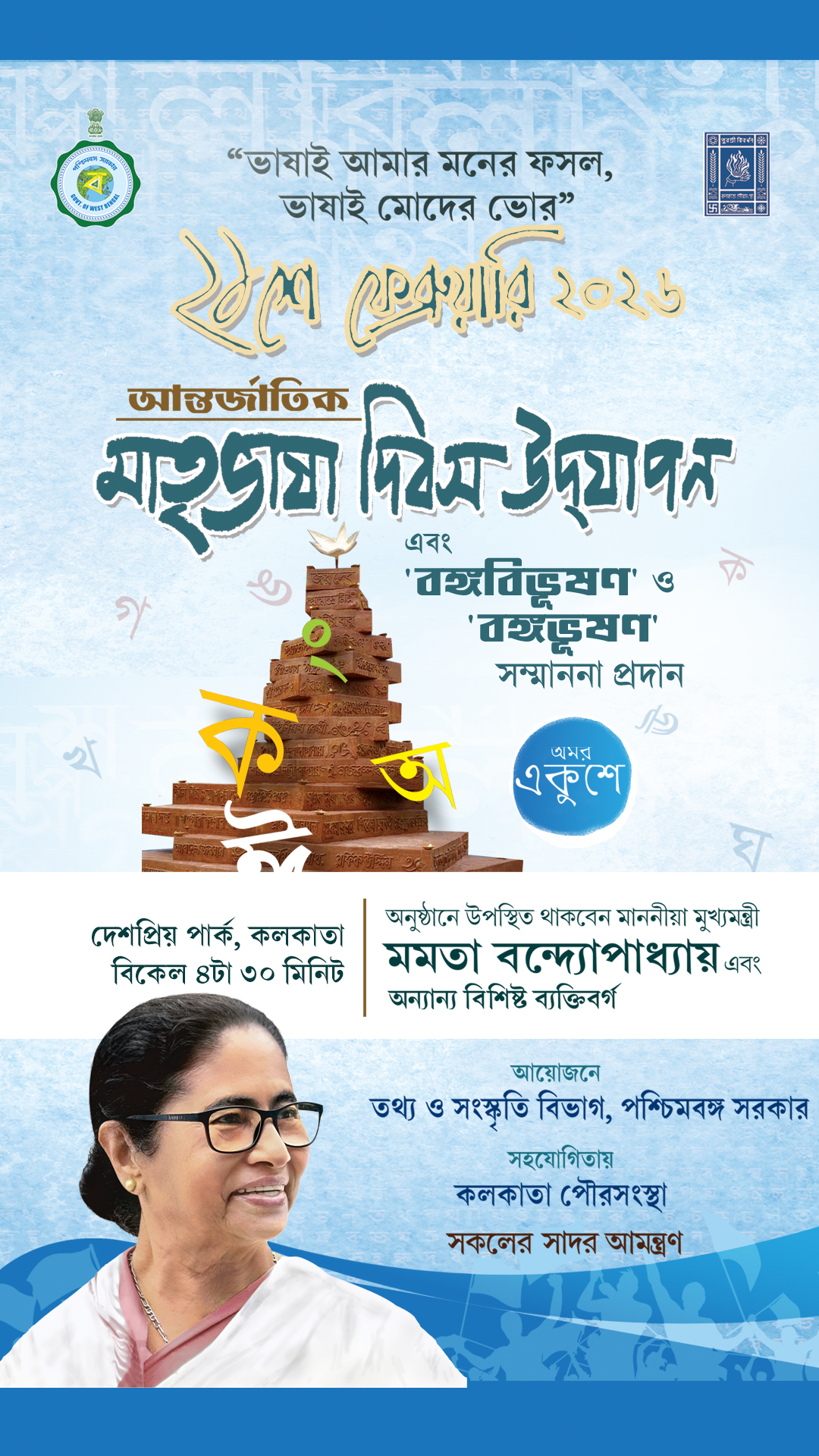 ‘ভাষাই আমার মনের ফসল, ভাষাই মোদের ভোর’- আন্তর্জাতিক মাতৃভাষা দিবসে (International Mother Language Day) শনিবার পশ্চিমবঙ্গ সরকারের তথ্য ও সংস্কৃতি বিভাগের তরফে দেশপ্রিয় পার্কে আন্তর্জাতিক মাতৃভাষা উদযাপন অনুষ্ঠানের আয়োজন করা হয়েছে। বিকেল সাড়ে চারটে নাগাদ দেশপ্রিয় পার্কে উপস্থিত থাকবেন বাংলার মুখ্যমন্ত্রী মমতা বন্দ্যোপাধ্যায় (Mamata Banerjee)। বাংলা গান কবিতায় ভাষা আন্দোলনকে স্মরণের পাশাপাশি এদিন বঙ্গবিভূষণ ও বঙ্গভূষণ সম্মাননা প্রদানও অনুষ্ঠিত হবে। সাহিত্য ও সংস্কৃতি জগতের খ্যাতনামা ব্যক্তিত্বরাও উপস্থিত থাকবেন।