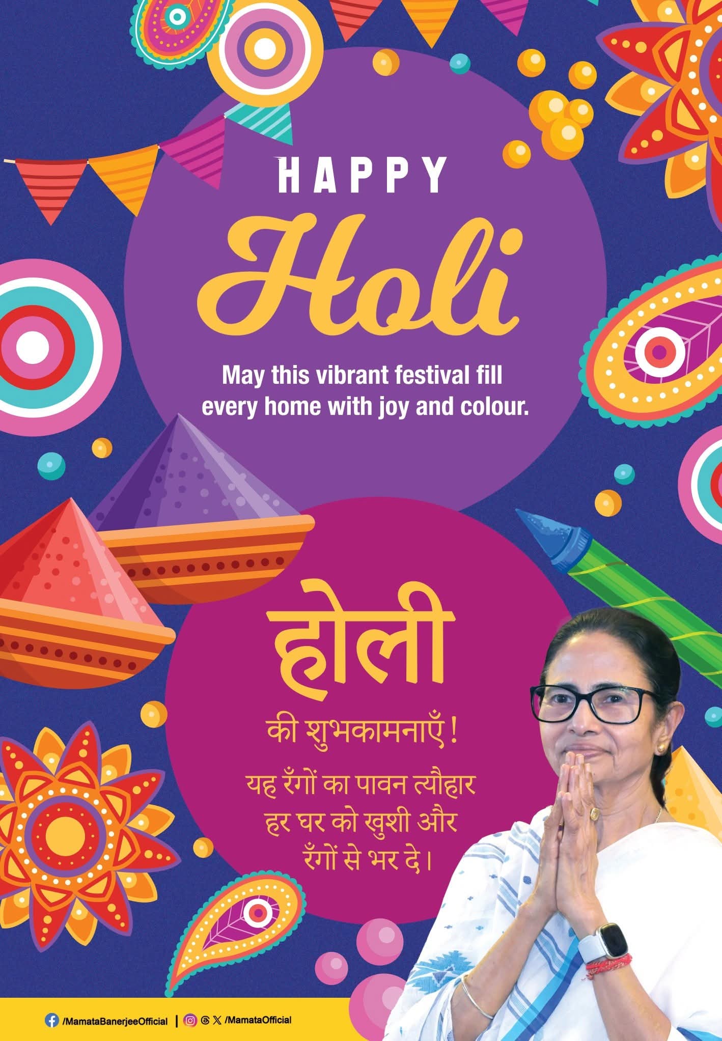 বাঙালির দোল পূর্ণিমা উদযাপনের ঠিক পরের দিন দেশ জুড়ে হোলি উৎসব (Holi Celebration)। কাশ্মীর থেকে কন্যাকুমারী আজ রঙিন হয়ে ওঠার পালা। বুধবার সকালে হোলি উপলক্ষে সকলকে শুভেচ্ছা জানিয়েছেন বাংলার মুখ্যমন্ত্রী মমতা বন্দ্যোপাধ্যায় (Mamata Banerjee)। রঙের উৎসবে সকলের জীবন আনন্দে ভরে উঠুক, এই কামনা করেছেন তিনি।