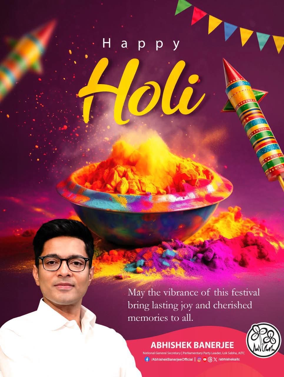 এদিন সোশ্যাল মিডিয়ায় হোলির শুভেচ্ছা জানিয়েছেন তৃণমূল কংগ্রেসের সর্বভারতীয় সাধারণ সম্পাদক অভিষেক বন্দ্যোপাধ্যায়ও (Abhishek Banerjee)।
