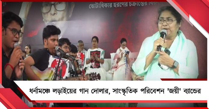 এসআইআরের (SIR) মাধ্যমে বৈধ ভোটারদের নাম বাদ দেওয়ার প্রতিবাদে ধর্মতলায় ধর্না দিচ্ছেন তৃণমূল সুপ্রিমো মমতা বন্দ্যোপাধ্যায় (Mamata Banerjee)। শুক্রবার রাতভর তিনি একাই ছিলেন মঞ্চে। শনিবার সকাল সাড়ে দশটা থেকে দ্বিতীয় দিনের কর্মসূচি শুরু হয়। এদিন যুবসাথী (Yuva Sathi) প্রকল্প নিয়ে বড় ঘোষণা করেন মুখ্যমন্ত্রী। এরপরই মঞ্চে সংস্কৃতিক পরিবেশনায় একের পর এক সঙ্গীতানুষ্ঠান ‘জয়ী’ (Joyee Band)ব্যান্ডের। দলীয় নেত্রীর অনুরোধে এদিন খালি গলায় গান গেয়ে শোনান রাজ্যসভার সাংসদ দোলা সেনও (Dola Sen)।