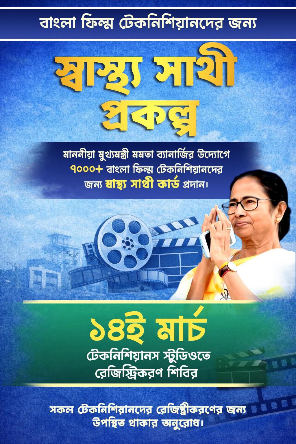 স্টুডিও থেকে মুখ্যমন্ত্রীকে এই পদক্ষেপের জন্য ফের ধন্যবাদ জানিয়েছেন দেব। এদিন সকাল থেকেই টেকনিশিয়ান স্টুডিওতে স্বাস্থ্যসাথী কার্ডের জন্য ভিড় জমান কলাকুশলীরা। বেশ কয়েকজনের সঙ্গে হাসিমুখে কথা বলতেও দেখা যায় রাজনীতিতে নবাগতা অভিনেত্রী- সাংসদ কোয়েলকে।