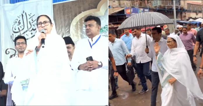 শনিবার রেড রোড থেকে সরাসরি পার্ক সার্কাস বেকবাগানের লাল মসজিদে যান মমতা – অভিষেক। প্রতিবছর ইদের দিনে মুখ্যমন্ত্রীর এই কর্মসূচি সর্বজনবিদিত। তাই মমতাকে দেখার জন্য রাস্তায় উপচে পড়া ভিড় লক্ষ্য করা যায়। সাদা মসজিদ ও লাল মসজিদের মাঝে প্রায় ৩০০-৩৫০ মিটার রাস্তা হেঁটে জনসংযোগ করতে দেখা যায় মুখ্যমন্ত্রীকে। ছাতা নিয়ে সঙ্গে ছিলেন অভিষেকও। রাস্তার দু’ধারে মানুষজন মমতা বন্দ্যোপাধ্যায়ের নামে জয়ধ্বনি দেন। কেউ ফুলের স্তবক এগিয়ে দেন, কারোর মুখে আবার জয় বাংলা স্লোগান। হাসিমুখে সকলকে হাত নেড়ে নমস্কার করেন মমতা। বৃষ্টি মাথায় নিয়ে গোটা রাস্তায় নেত্রীর পাশে হাঁটতে দেখা যায় অভিষেককেও। তিনিও হাসিমুখে সকলের অভিবাদনের প্রতিক্রিয়া জানান।